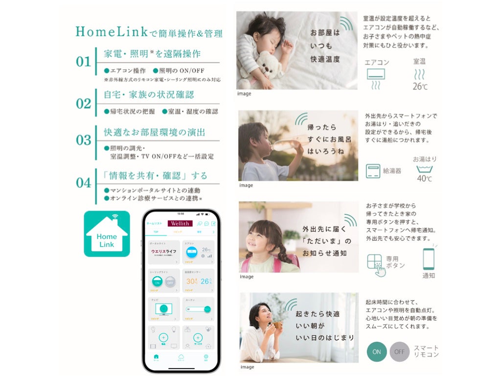ウエリス仕様に開発したIoTプラットホームアプリ「HomeLink」(以下、「本アプリ」)を使用することで、ご入居者様はインターホンや給湯器の遠隔操作に加え、入居後に設置するエアコン、テレビなどの家電制御、マンションポータルサイトへのアクセス、取扱説明書の閲覧などがワンアプリで利用可能です。また、オンライン診療やオンライン服薬指導などのソフトサービスとの連携も可能です。