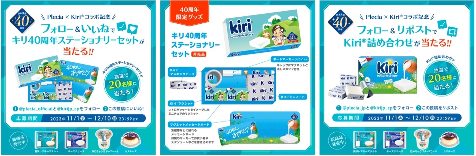 「キリ」日本発売40周年を記念して、11月1日(水)〜12月10日(日)まで、フォロー&いいねで「キリ」40周年ステーショナリーセットが当たるキャンペーンと、フォロー&リポストで「キリ」詰め合わせが当たるキャンペーンを同時開催します。