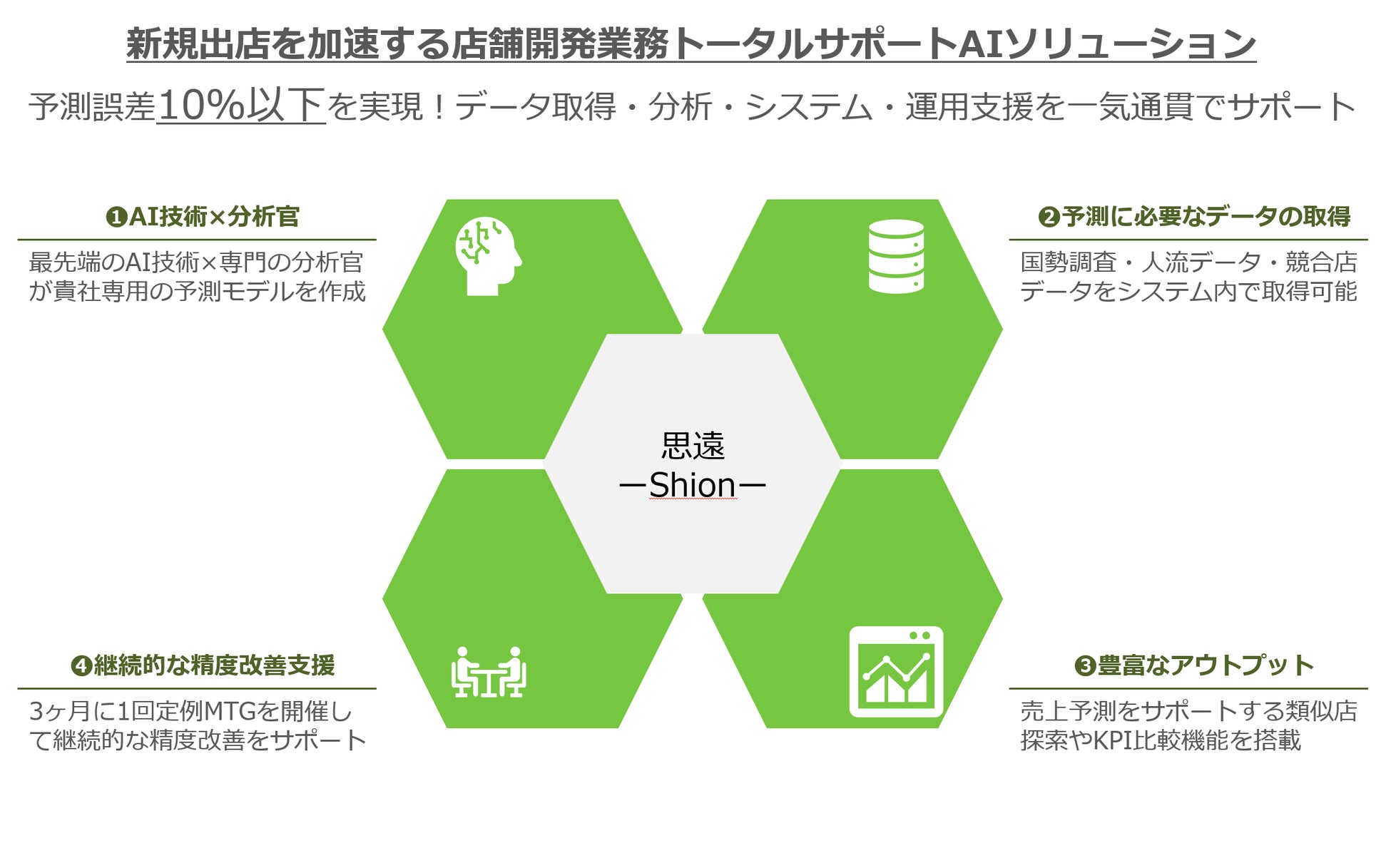 「思遠」は、データ収集から予測モデルの構築、そして継続的な精度改善支援をワンストップで提供するサービスです。クライアントは複雑なプロセスを自社で実施する必要がなくなります。また、思遠の導入により市場分析の精度が向上します。その結果、企業の出店計画の精度と効率が大幅に向上します。さらに、豊富なアウトプットが出店評価の意思決定を強力にサポートし、クライアントが戦略的に出店計画を推進するための確かな基盤を提供します。