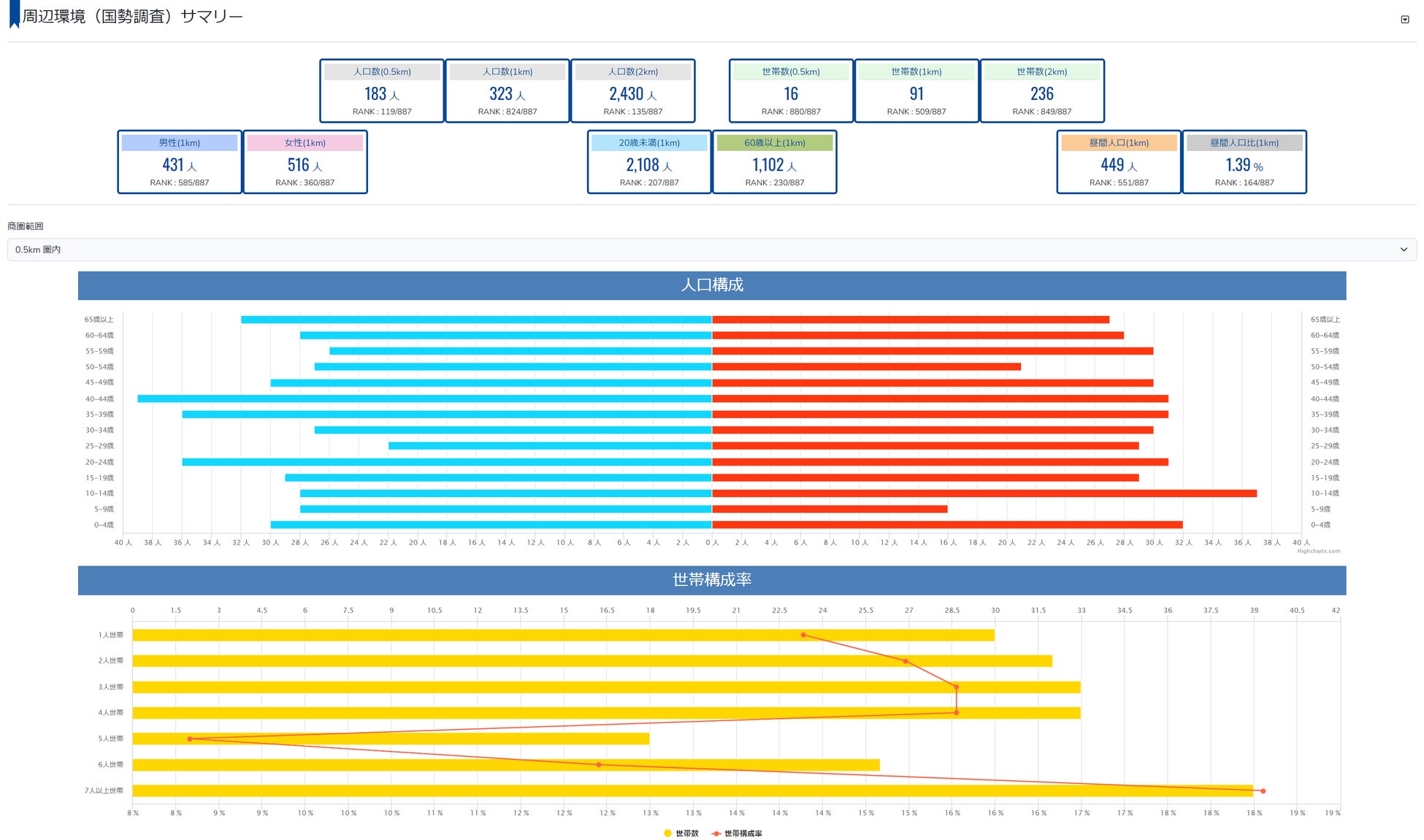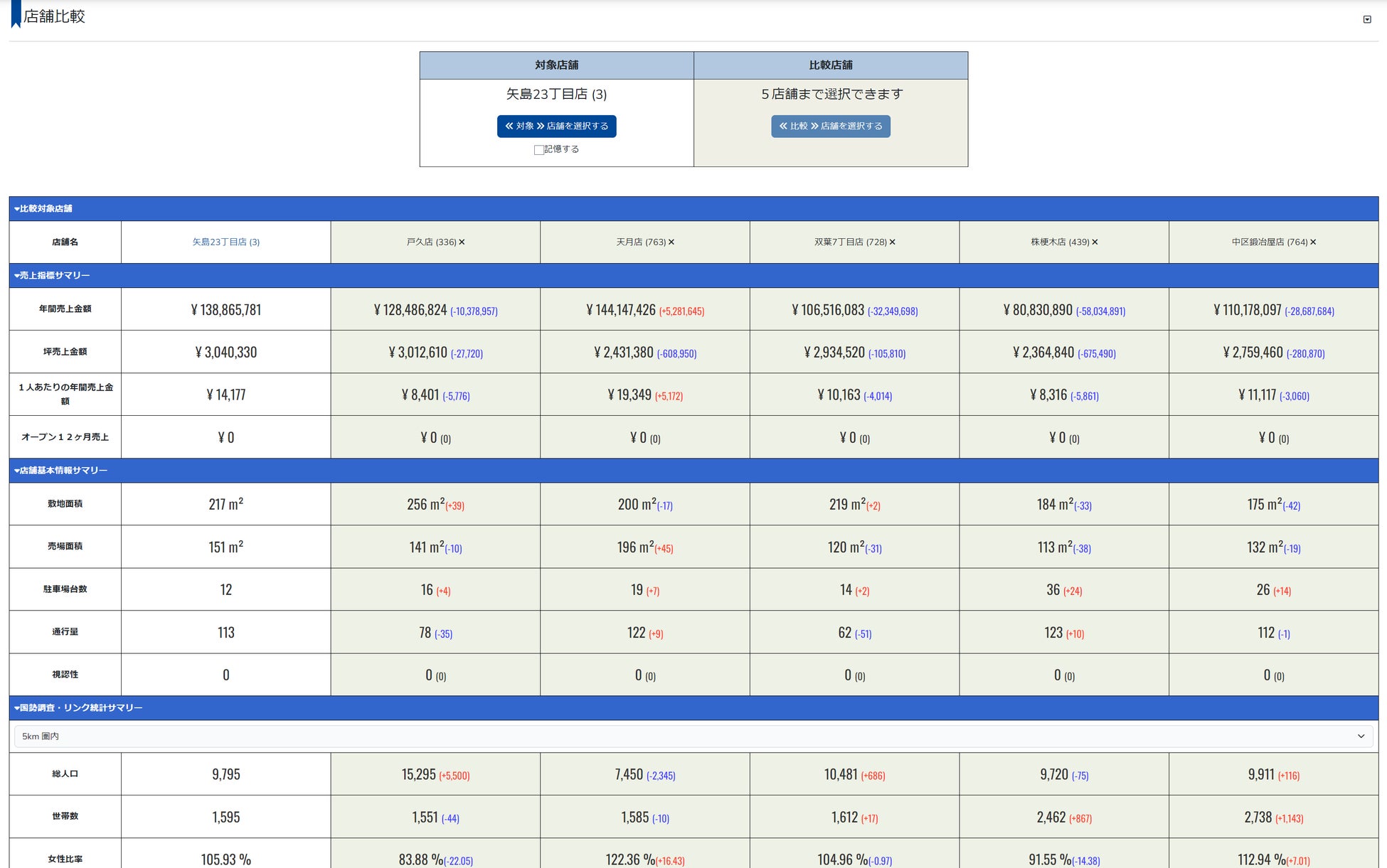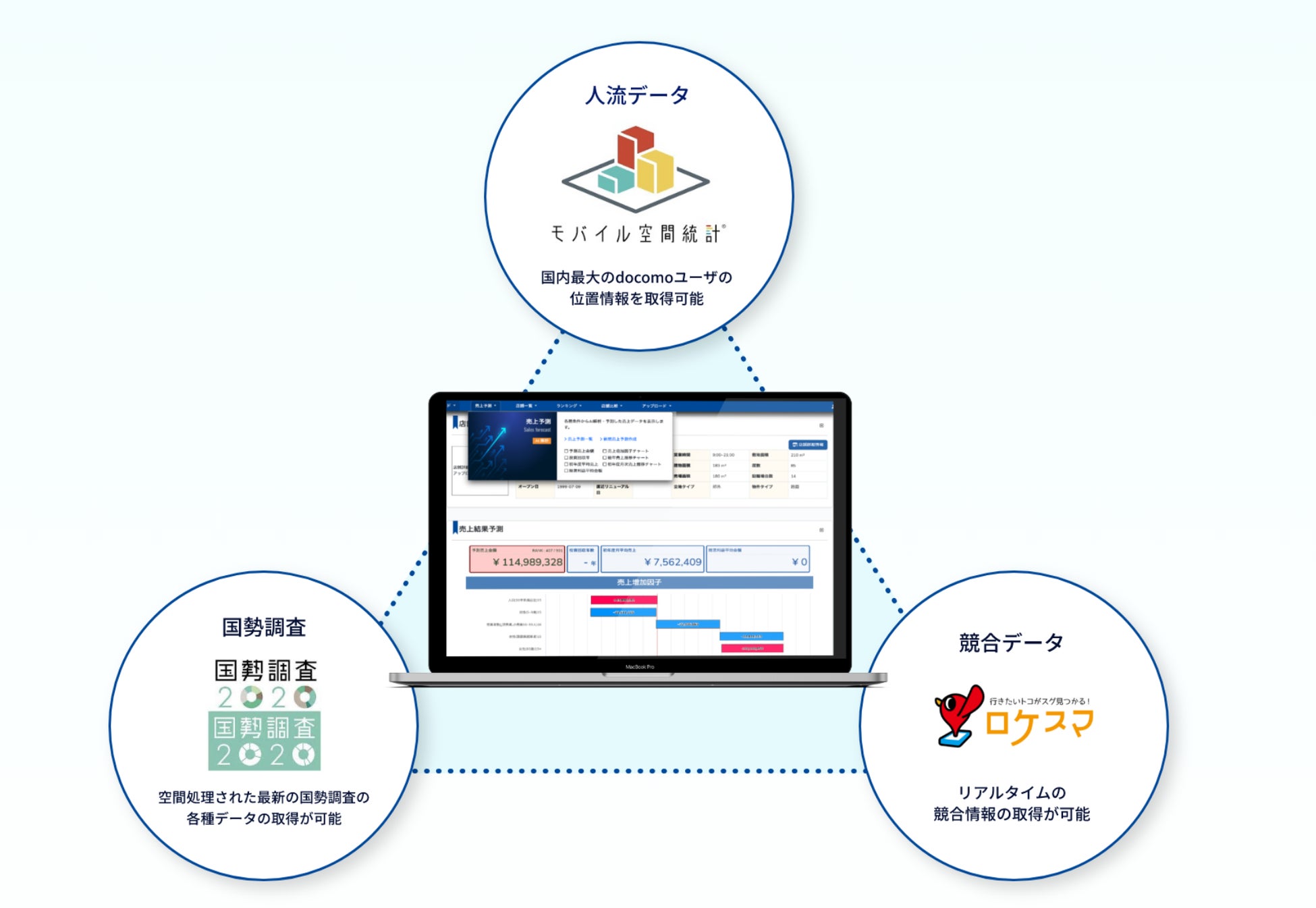 国勢調査、人流データ、競合データを含む予測分析に必要な情報を自動的に取得・集計します。これにより、既存店舗や候補物件周辺のエリアデータを効率的に分析できます。