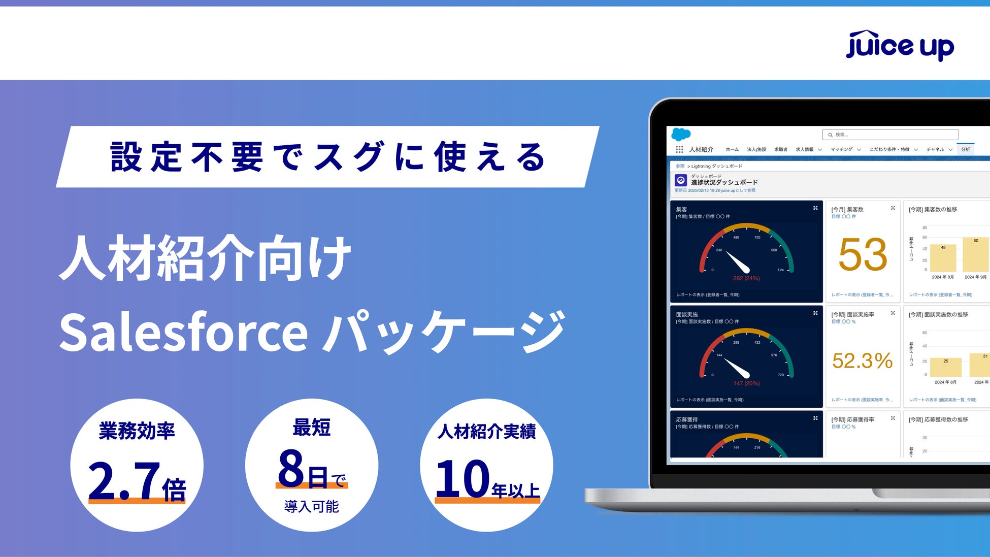 人材業界出身メンバーが創業し、自社でも人材紹介事業を運営しながら人材業界のコンサルティングを行う「人材業界の業務・悩みを知り尽くした」juice up(ジュースアップ)。その当社が深いSalesforceの専門知識を持って人材業界のDX推進を支援します。初めてのシステム導入でも安心できる、丸投げOK、失敗しない、成果につながるチャレンジが実現できます。