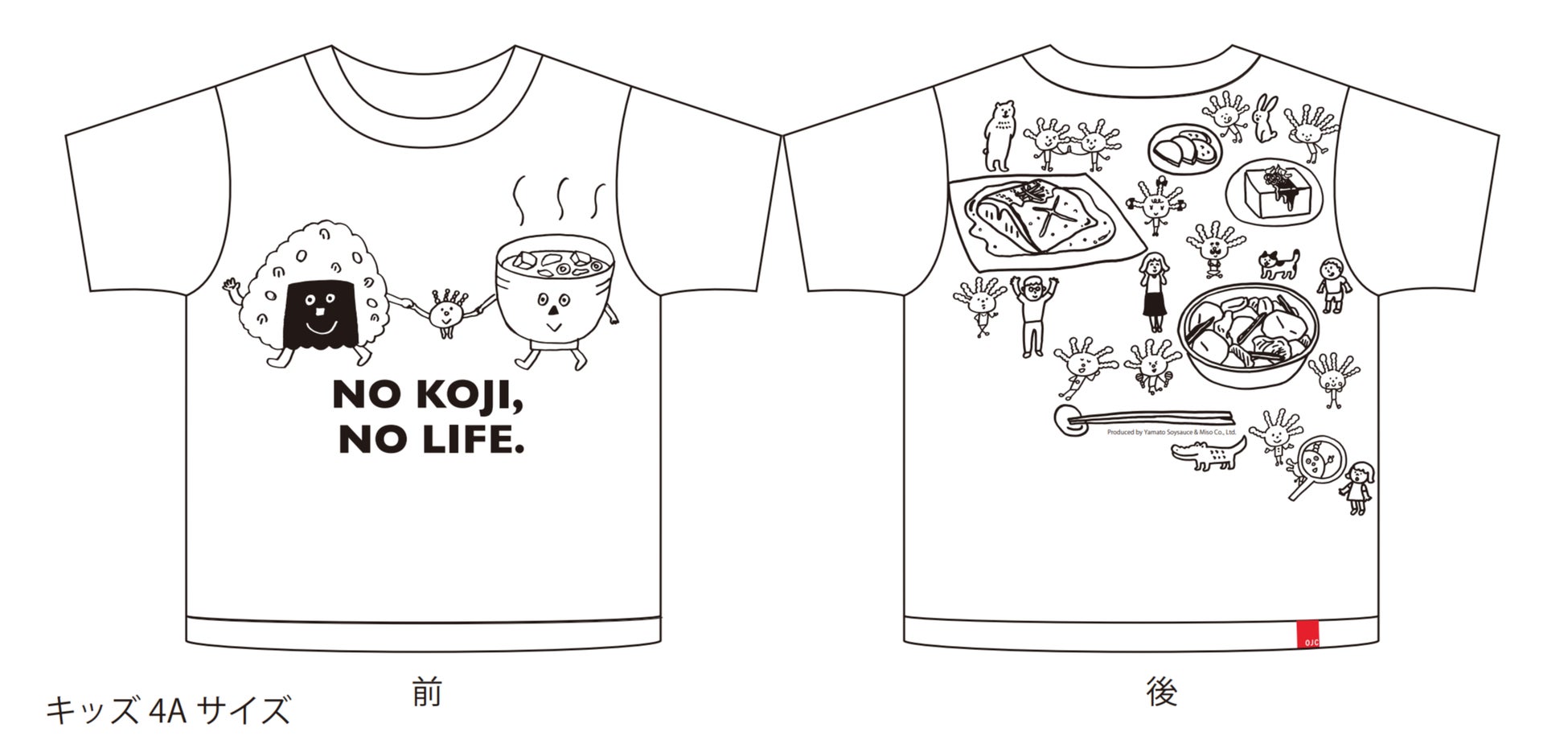 Tシャツのフロントでは「NO KOJI, NO LIFE.」のロゴと共に、お米などの穀物が、麹菌による発酵で、発酵食品に変化する様子を、麹菌が真ん中におにぎりと味噌汁が仲良く手を繋いでいる姿で表現しました。また、バックでは、さまざまなおかずの中で麹菌が活躍している様子が、OJICOらしいタッチで表現されています。