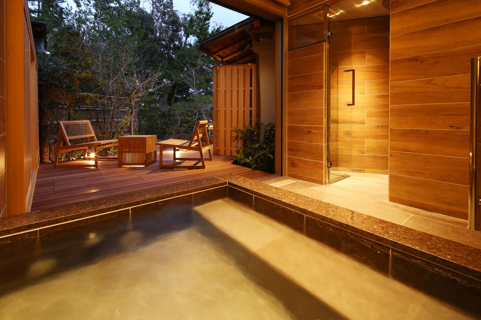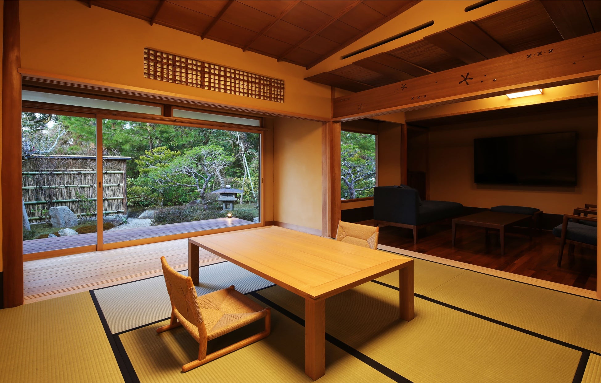 文殊堂岬の先端にあり、周囲にある天橋立・阿蘇海との調和に配慮した日本庭園の眺めとその四季・空気を体感できるよう半露天風呂、客室一面に繋がるテラスを設置して室外もプライベート空間として楽しむ事ができます。