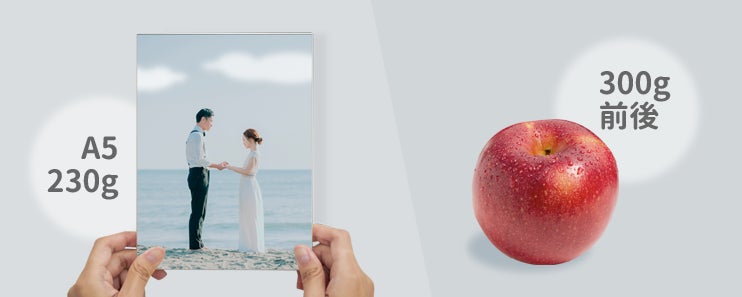 アクリルフォトは軽量で、リンゴ約1個分とほぼ同じ重さです。そのため、お部屋の好きな場所に気軽にディスプレイすることができます。さらに、汚れが付いた場合も、アクリル表面をサッと拭くだけで簡単にお手入れができます。
