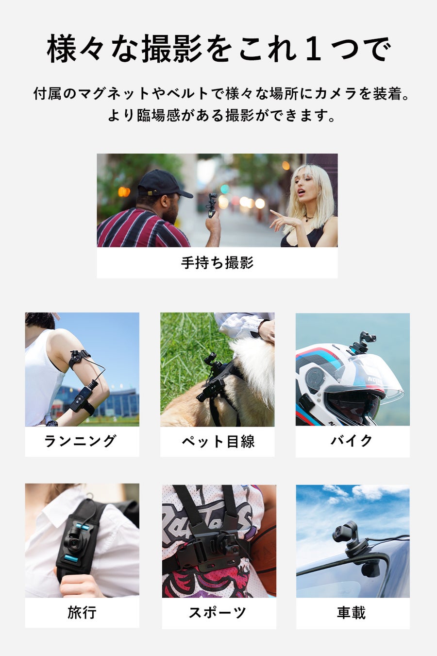 腕やバイク、車などさまざまな場所に自由に取り付けができ、軽量ながら迫力がある視点で映像撮影を行うことができます。