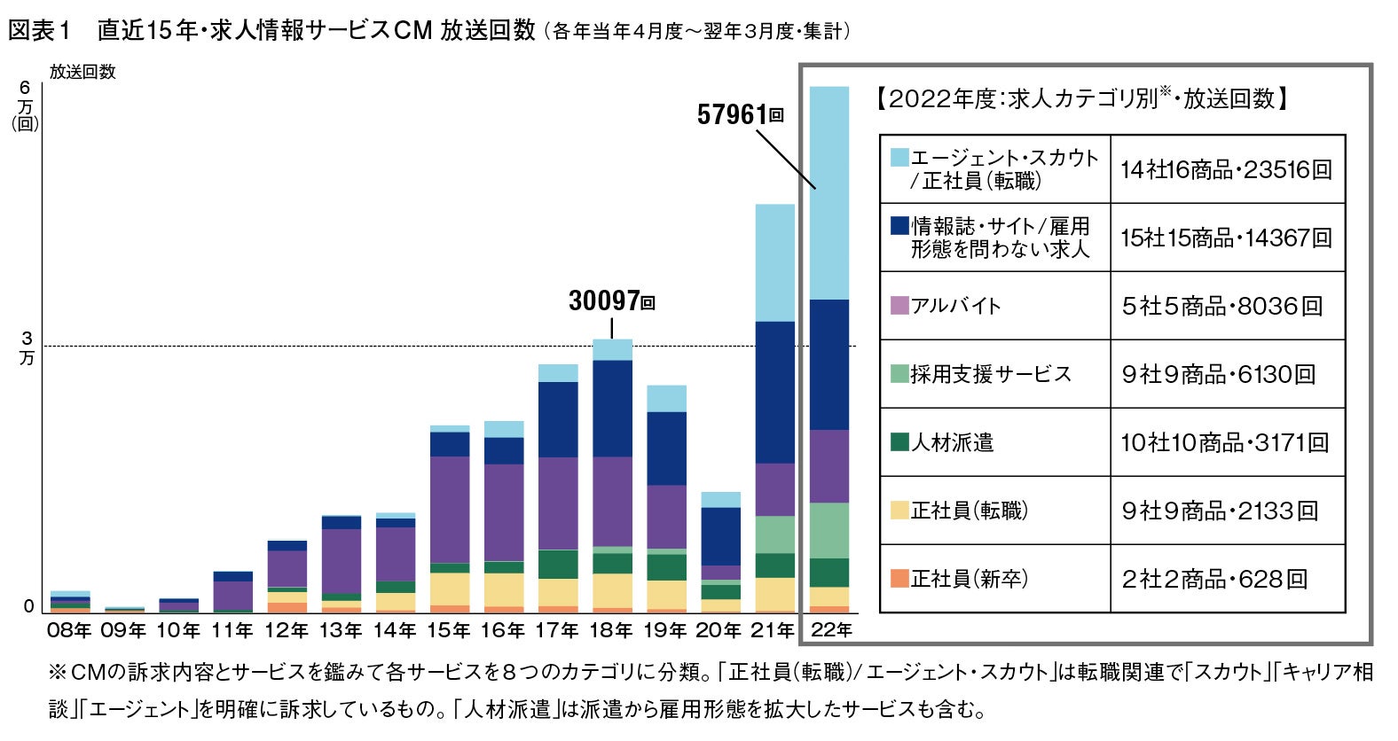 直近15年の求人情報サービスのCMオンエア状況を見ると(図表1)、リーマンショック直後の2009年度を底に以降は増加傾向となり、有効求人倍率がバブル期を上回った2018年度には26社41商品・サービスの計30097回が観測された。コロナ禍の影響を受けた2020年度の放送回数は前年度から半減するも、翌年は一転して大きく増加。2022年度は46社66商品・サービスから189作品がオンエアされ、過去最多となる57961回を記録した。