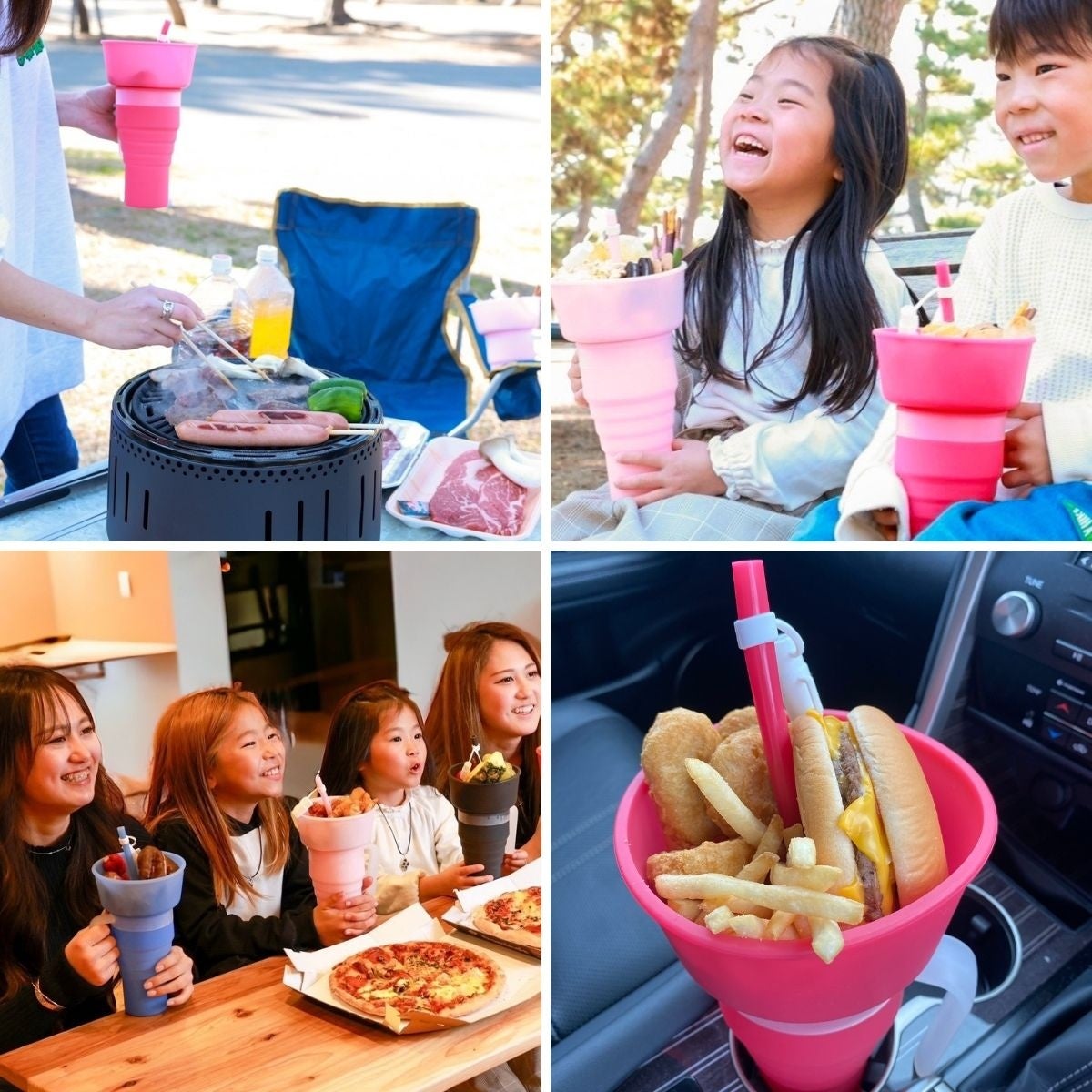 販売開始後には「ドライブで使用したい」との声が多く出ている。車のカップホルダーにもスッポリ入るサイズ感であり運転席からの飲食にも向いているが、後部座席のチャイルドシートに座った子供たちに飲食させるのに非常に便利である!ドライブスルーで購入したポテトやナゲットを入れるのもおすすめだ。