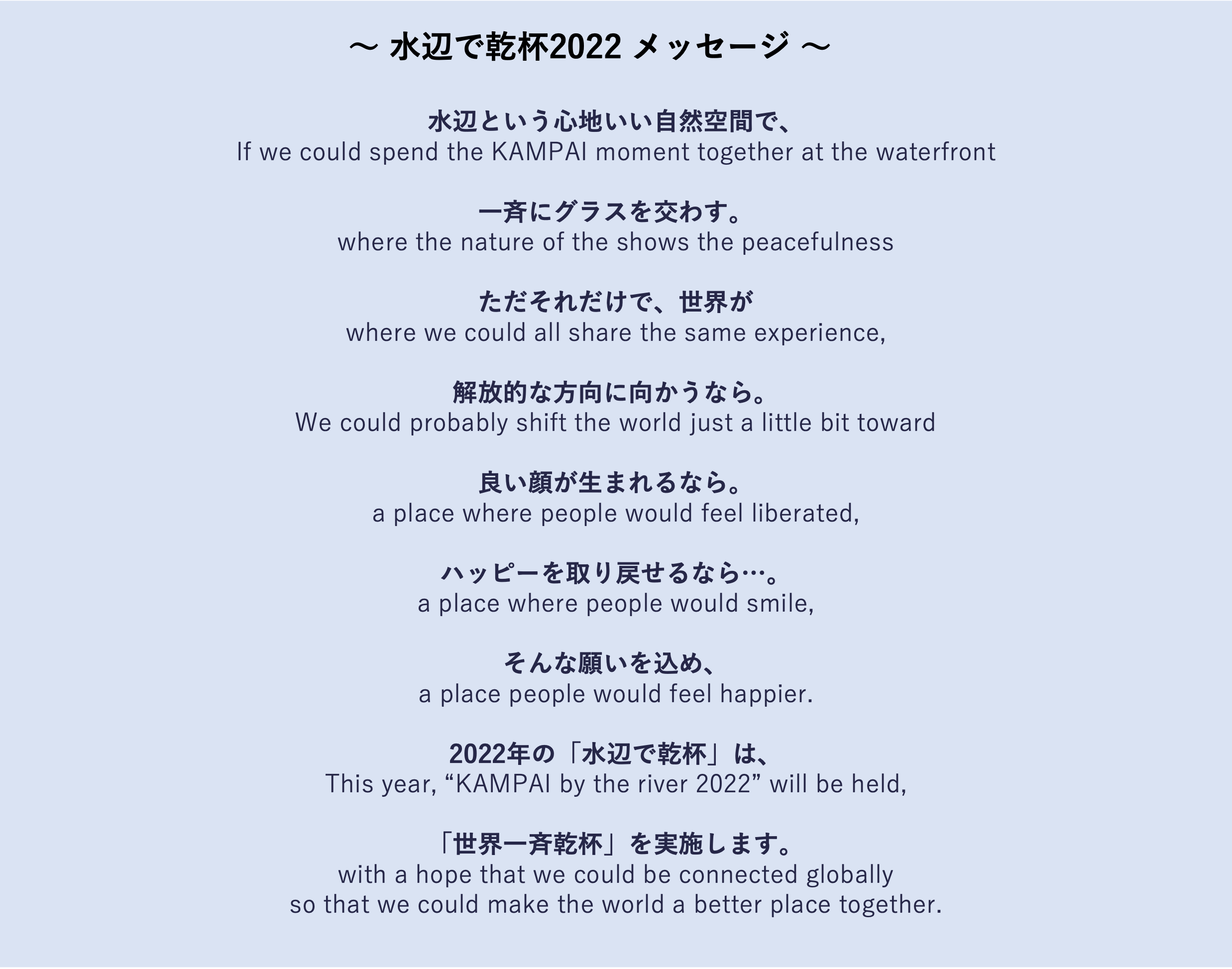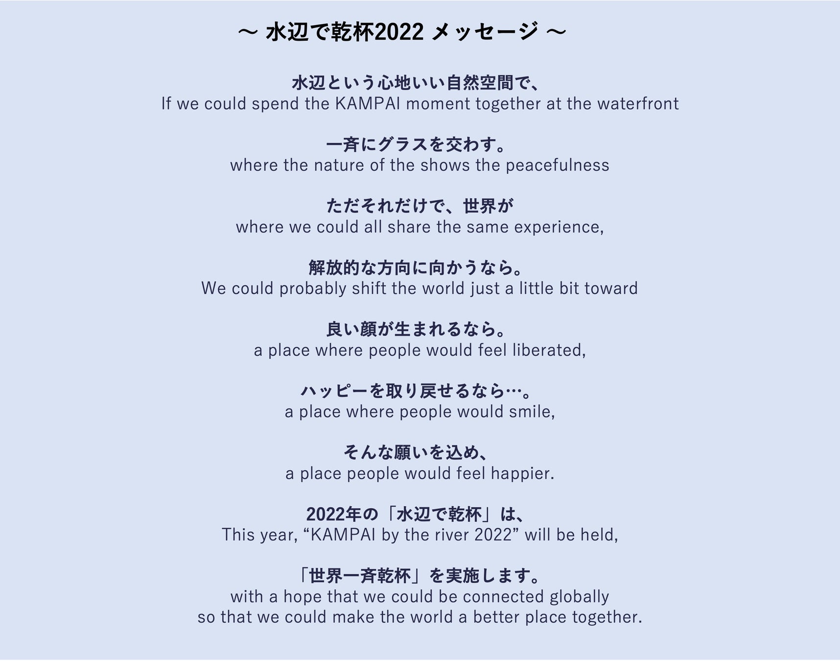 毎年7月7日午後7時7分に全国の水辺で一斉に乾杯をする「水辺で乾杯」。“水辺にもっと触れるきっかけをつくろう” “水辺に新しいシーンをつくりだそう” とスタートしたこの取り組みは、わずか30人の小さなコミュニティーから始まりました。水辺を感じられる場所で青いもの身につけて乾杯するというシンプルな取り組みですが、様々なメディアでとりあげられると共に、参加者個々のSNSで情報が発信され、乾杯が全国に拡大。今年はついに乾杯のムーブメントが海を渡り世界で一斉乾杯を実施します。