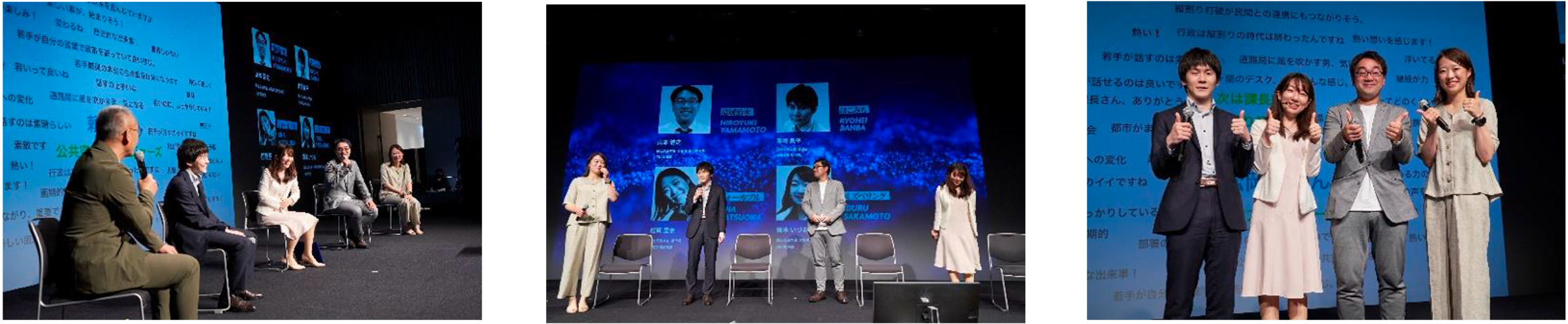 国交省の水管理・国土保全局 山本浩之さん、同じく坂本いづるさん、道路局 番場良平さん、都市局 松岡里奈さんの4名の若手職員の方々に登壇いただき、水辺だけではなく、それぞれ領域の最先端のチャレンジについて、そしてこれからの国交省について本音で語っていただきました。