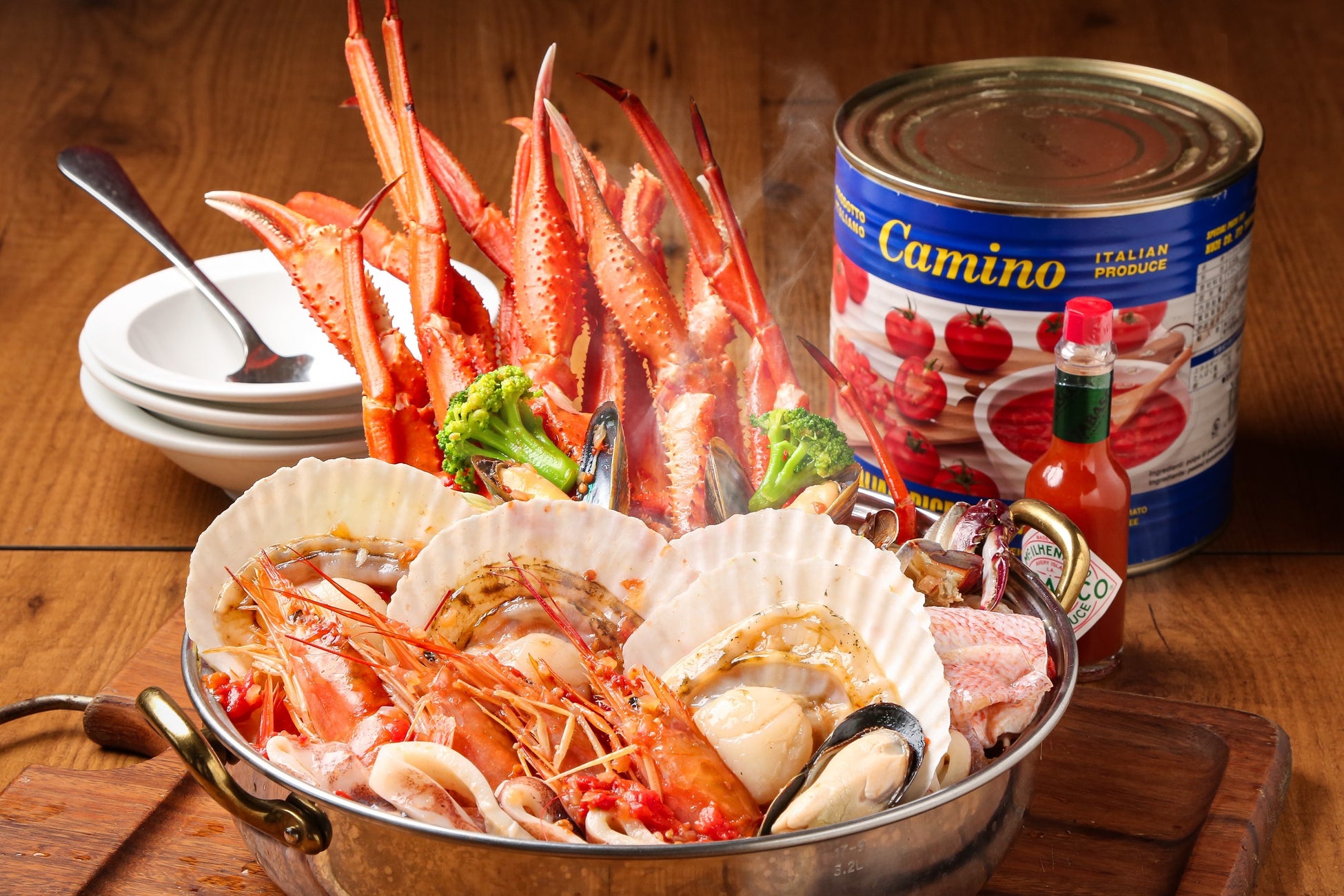 ワタリガニ・赤海老・烏賊・ムール貝・ホタテ・赤魚など、たっぷりの魚介を使用した濃厚な旨みが感じられる贅沢なブイヤベース鍋です。