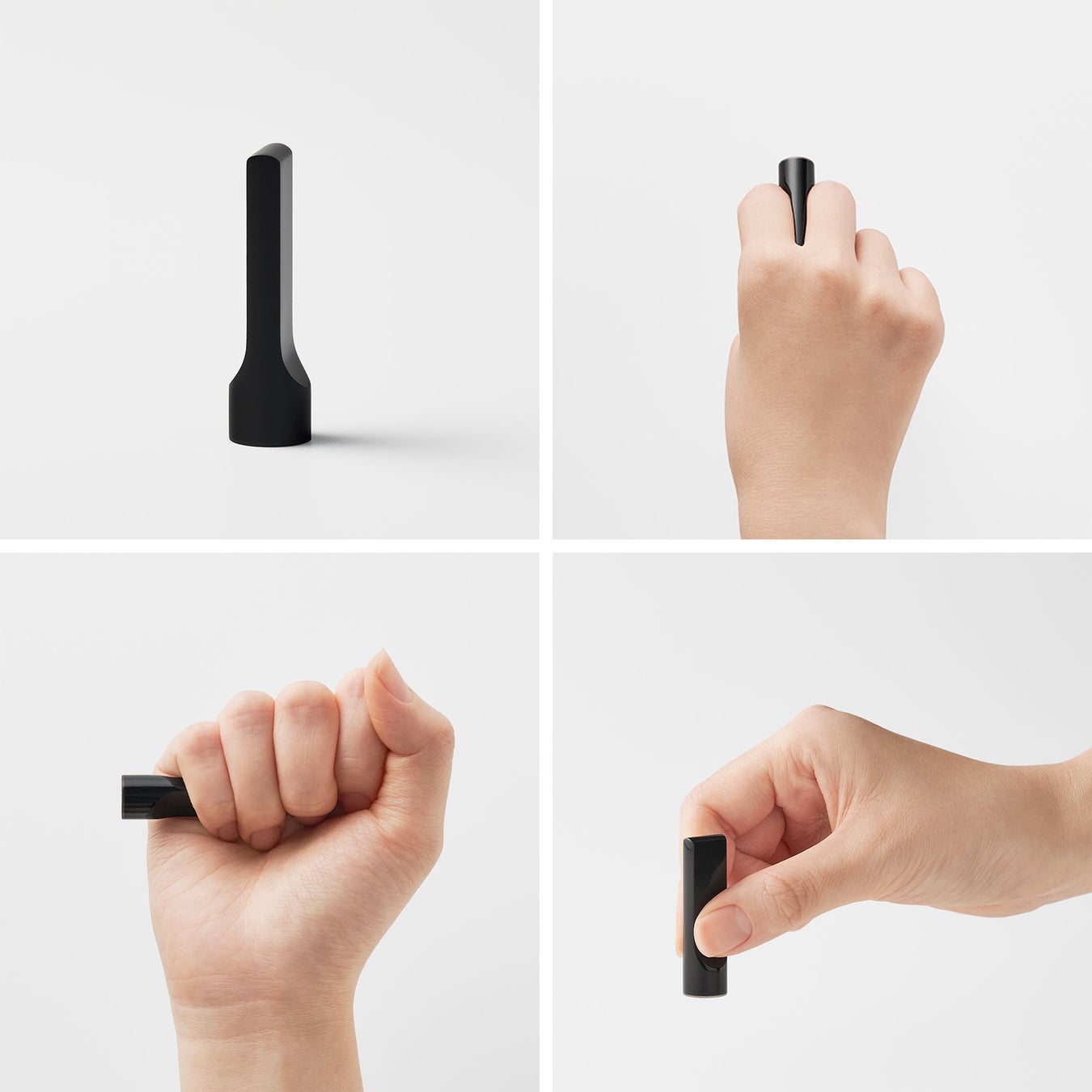色々な持ち方に対応できるはんこの提案。薄い形状にすることで、手の中で安定する場所が増え、形状から方向が分かりやすく、持ちながらでも印の傾きが確認しやすい。