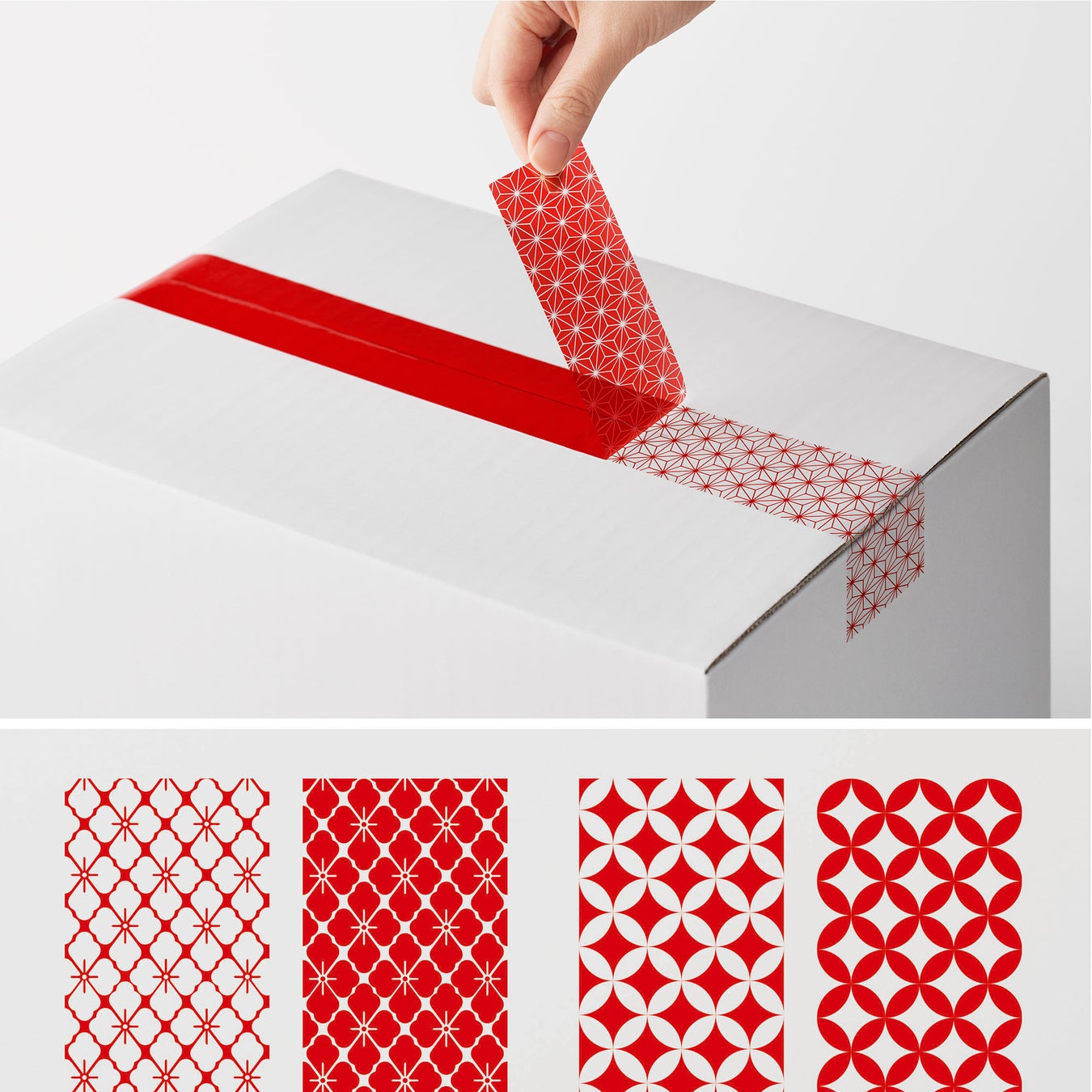 梱包の細部にも相手への心遣いを行き渡らせるテープ開封済みの跡が残る特殊なテープ。思わぬ部分に和柄が現れることで、テープを剥がすという作業のなかにも小さな驚きと感動が生まれ、美しさにふと心に立ち止まる瞬間をもたらしてくれる。