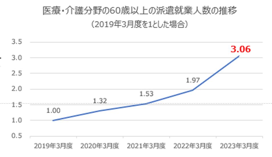 その結果、60 歳以上の派遣就業人数は、2019 年と比較して、3.06倍となりました(2023年3月度)。
