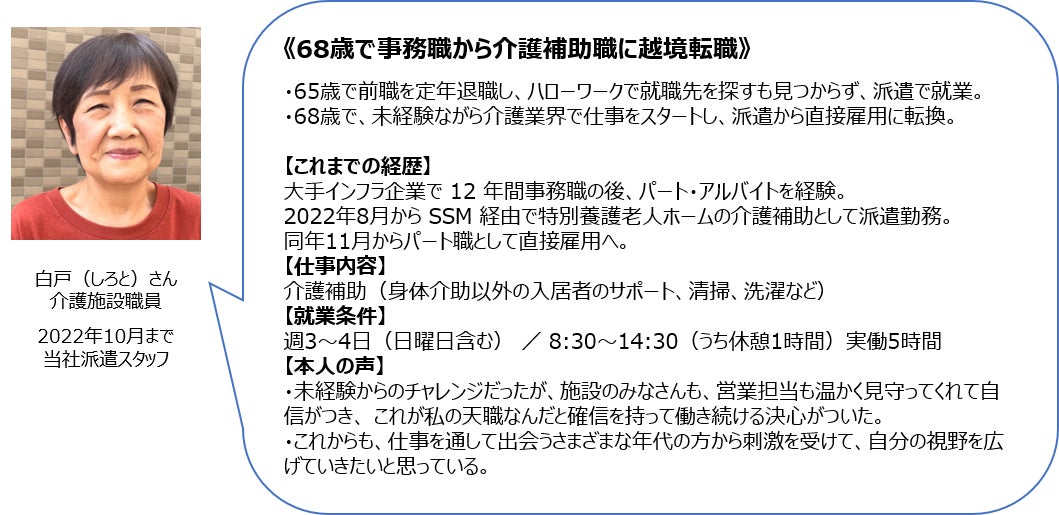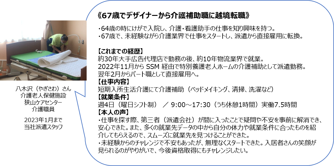 シニア人材は、資格や実務経験など目に見えるビジネススキルだけでなく、家事や育児などの人生経験によるコミュニケーション力や人への共感力、家事力、同時進行で複数の仕事を進めるマルチタスク力など、汎用性あるスキル(ポータブルスキル)が豊富です。就業と結びつきにくいポータブルスキルを、派遣会社がヒアリングしていく中で、就業に活用できるスキルとして一緒に棚卸しして見出します。求職者の特性を知った上で派遣先とマッチングをおこなうことで、特に育児・家事の経験や能力と親和性のある介護分野での活躍の場を創出しています。