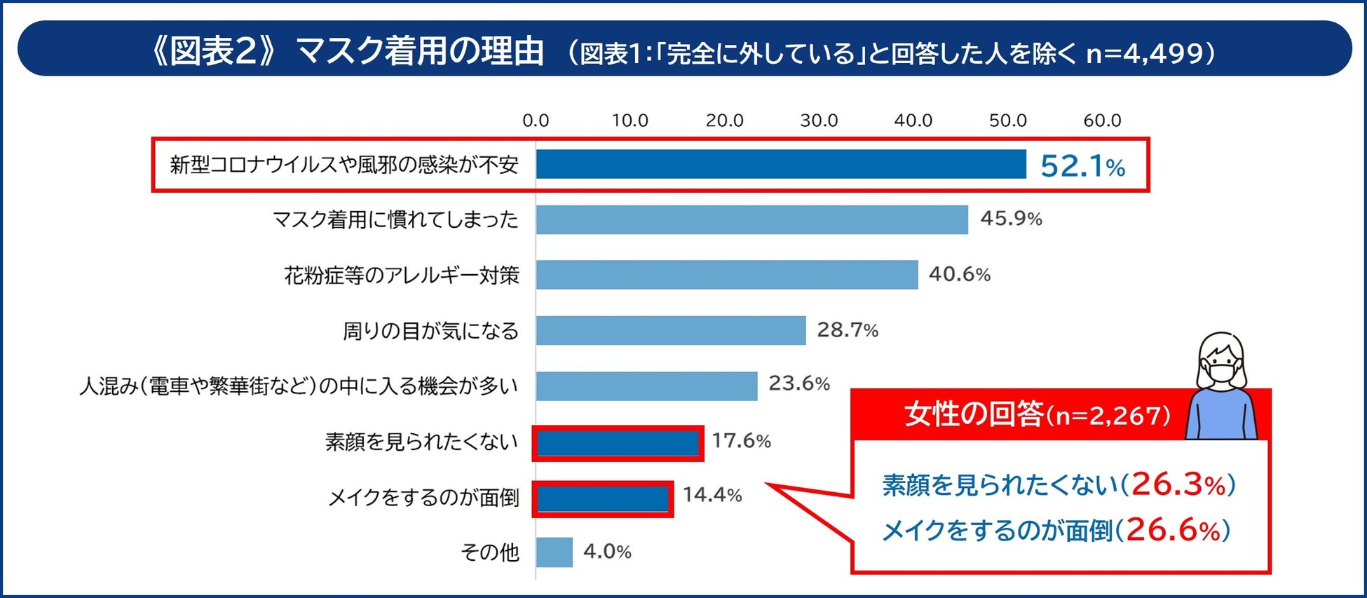 マスク着用ルールの緩和後も着用している理由は、「新型コロナウイルスや風邪の感染が不安」(52.1%)が最も多く、今でも感染症への不安を感じている人が半数以上いることが分かります。また、女性は約4人に1人が「素顔を見られたくない」(26.3%)、「メイクをするのが面倒」(26.6%)と回答しており、マスクの着用が定着したからこそ生じる状況の変化に対する抵抗感が見受けられます《図表2》。