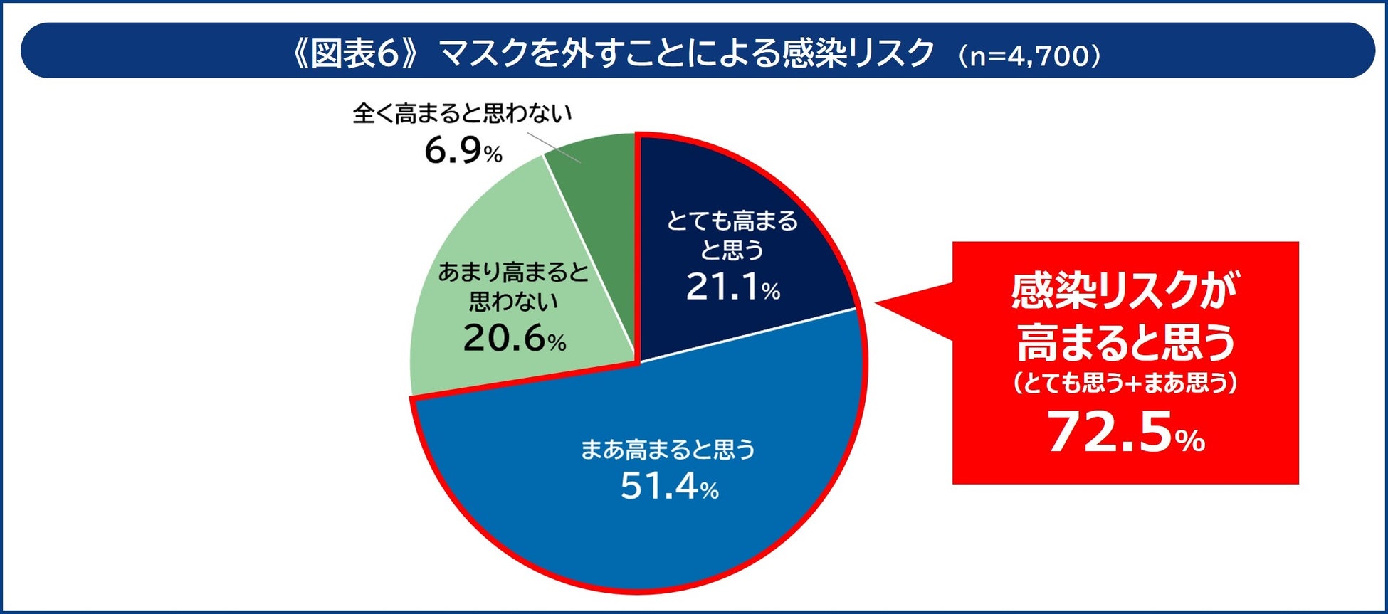 次にマスクを外すことによる感染リスクについて聞いたところ、7割以上(72.5%)が「高まると思う(とても思う+まあ思う)」と回答しました《図表6》。新型コロナの新規感染者数が落ち着きつつあるものの、依然として多くの人が不安を感じているものと考えられます。