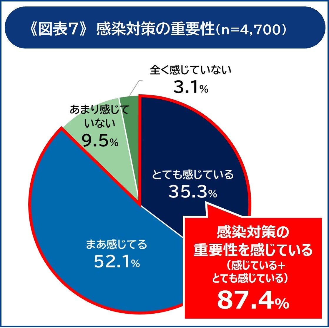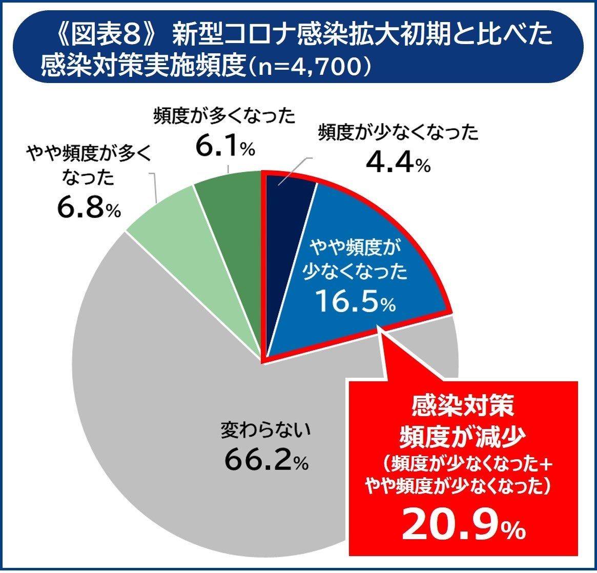 ■約9割が手指消毒や手洗い・うがいなどの感染対策の重要性を感じつつも、約5人に1人(20.9%)は新型コロナ感染拡大期(2020年)に比べ、感染対策の実施頻度が「少なくなった」と回答。