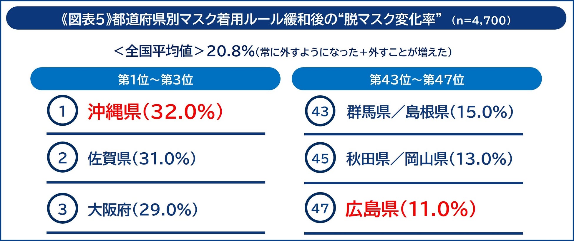 マスク着用ルール緩和後に最も変化のあった県は「沖縄県」 沖縄県は「外すことが増えた」と回答した割合が広島県の約3倍