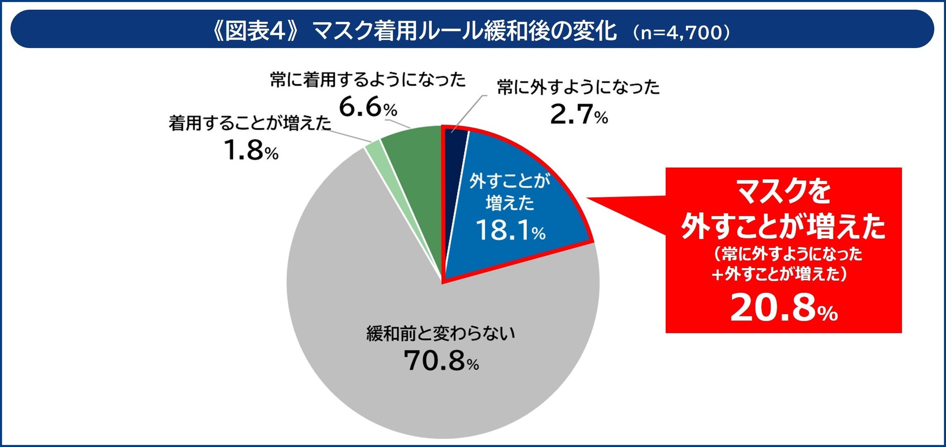 マスク着用ルール緩和後のマスク着用の変化について、約7割(70.8%)が「緩和前と変わらない」と回答。「常に外すようになった」(2.7%)または「外すことが増えた」(18.1%)と回答した割合の合計は約2割(20.8%)にとどまり、マスク着用ルールの緩和が、生活者の「マスク習慣」を大きく変えるには至っていないことがうかがえます《図表4》。
