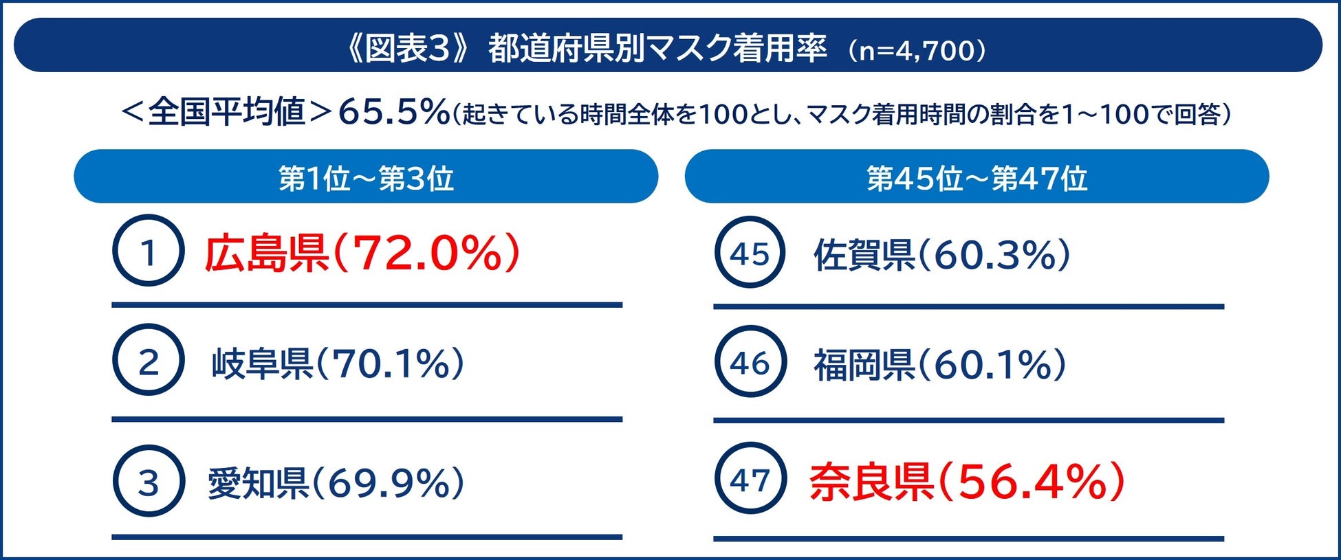 続いて、起きている時間全体を100%とした場合のマスク着用率(マスクを着用している時間の割合)について聞いたところ、全国平均値が65.5%であったのに対し、「広島県」は72.0%と7割を超え、全国で最もマスク着用率が高い結果となりました。一方、最もマスク着用率の低い都道府県は「奈良県」(56.4%)でした《図表3》。