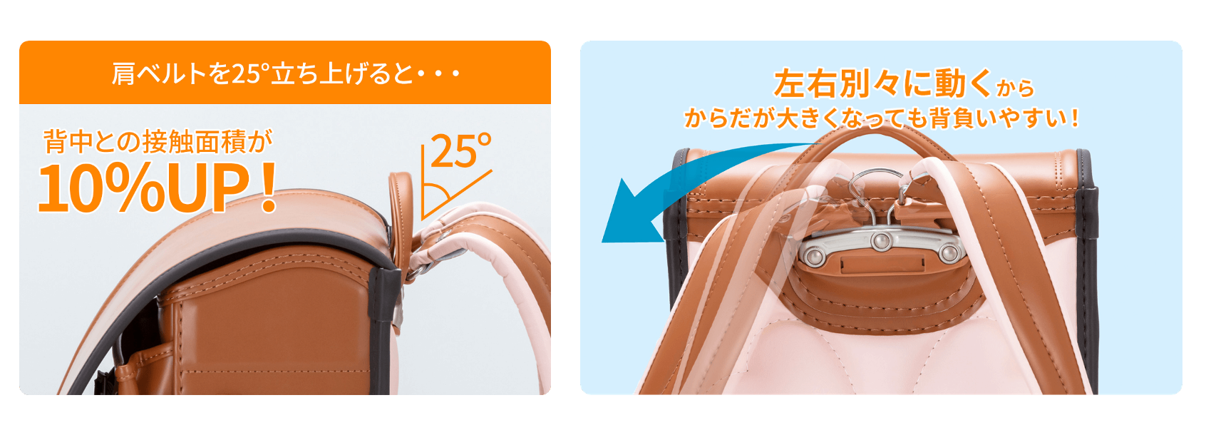 肩ベルトを25度立ち上げることで、カバン本体とお子さまの背中との接触面積が10%アップ。自然な姿勢を保ち、肩への負担が約50%に軽減されて、軽く感じることができます。