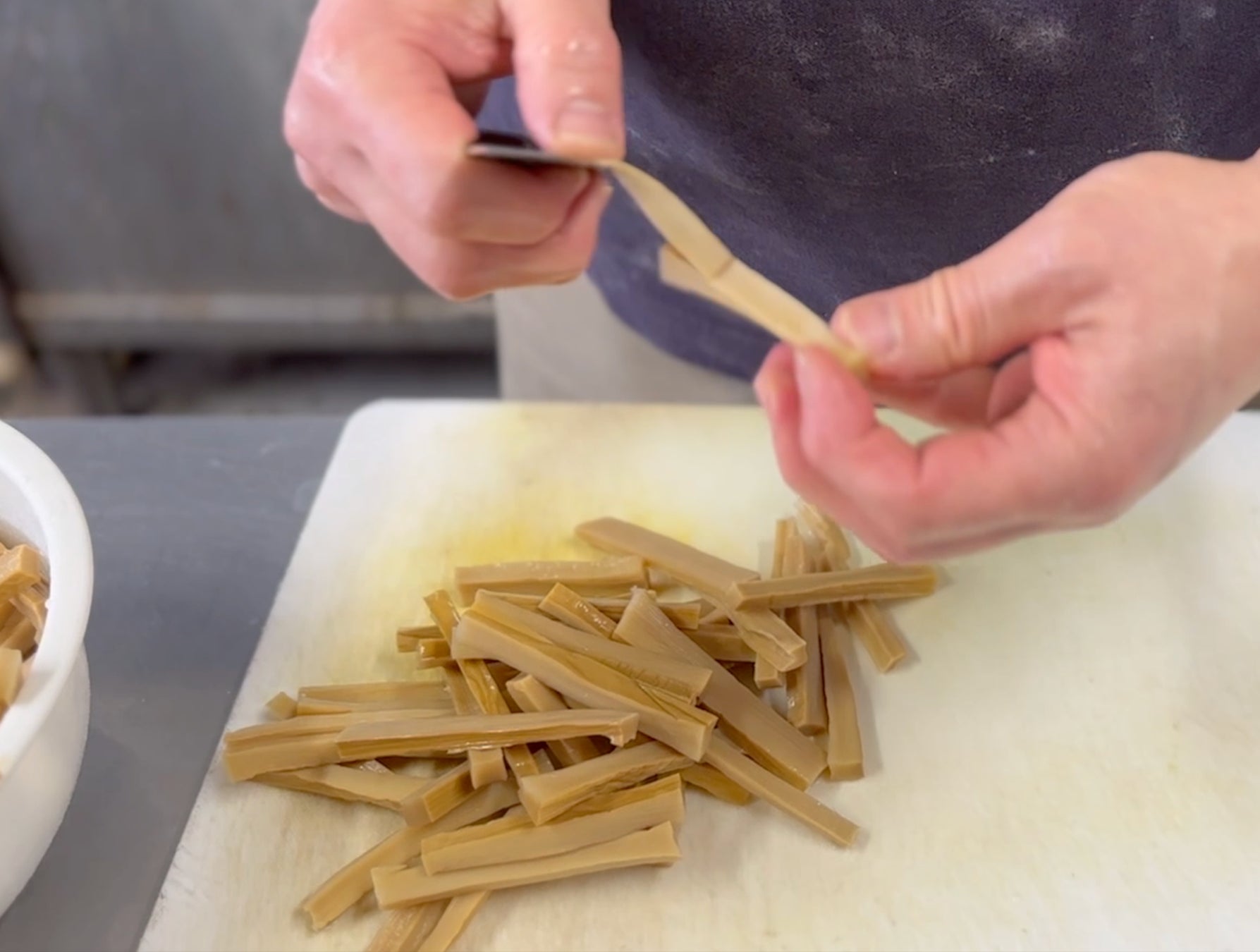 メンマには片側表面に皮が付いているが、その皮を1本1本剥いていると言う。