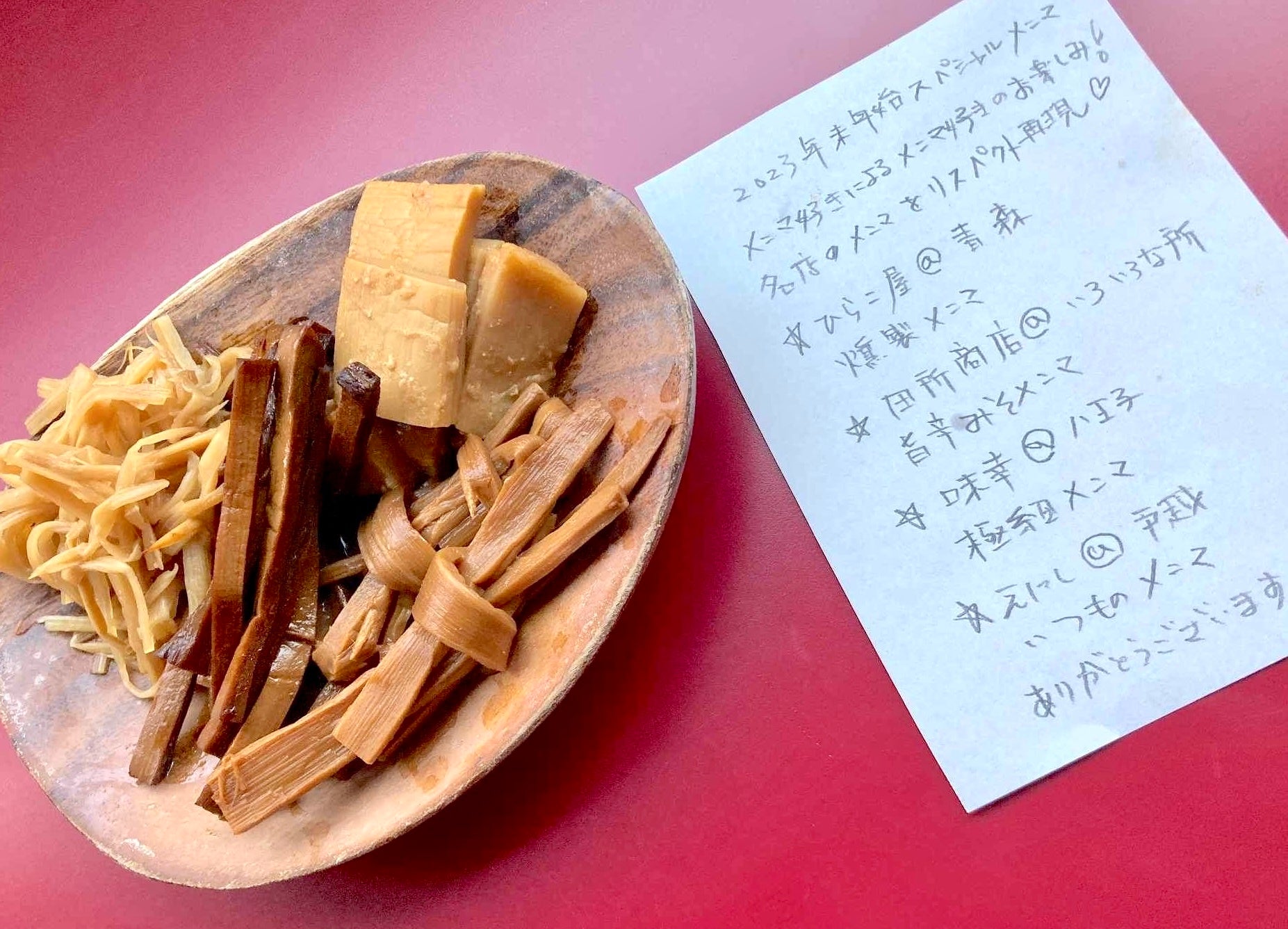 あと、半分は個人的な趣味の世界ですがその年に食べた他店さんのメンマをリスペクト再現してスペシャルメンマ盛りを提供しています。」