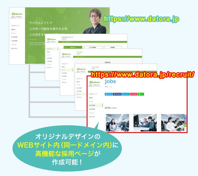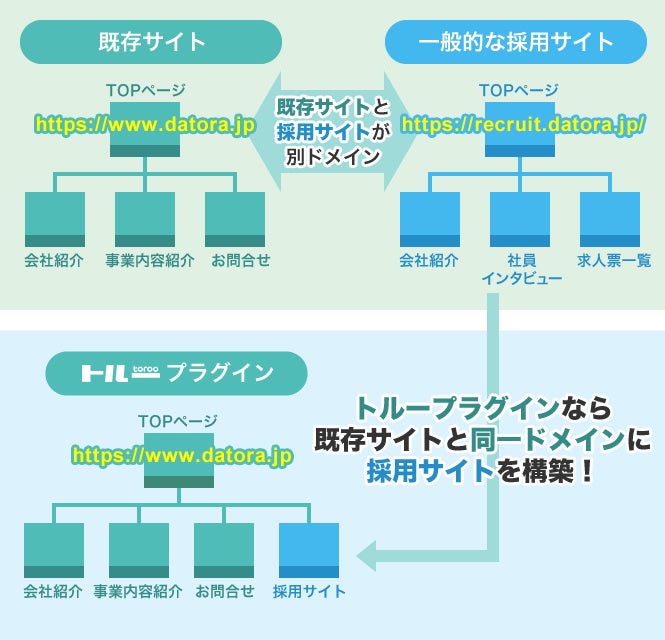 また一般的なCMSで採用サイトを作成する場合、自社の企業サイトとは独立した別ドメインのサイトとなってしまいますが、「トループラグイン」では自社のWEBサイト内に組み込むことができますので同一ドメインで運用することが可能な点もメリットの1つです。