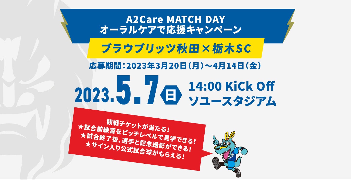 その活動の一環として、2023年5月7日(日)ソユースタジアム(秋田県秋田市)にて行われる、明治安田生命J2リーグ第14節ブラウブリッツ秋田vs栃木SCの試合を『A2Care MATCH DAY』と題して実施いたします。
