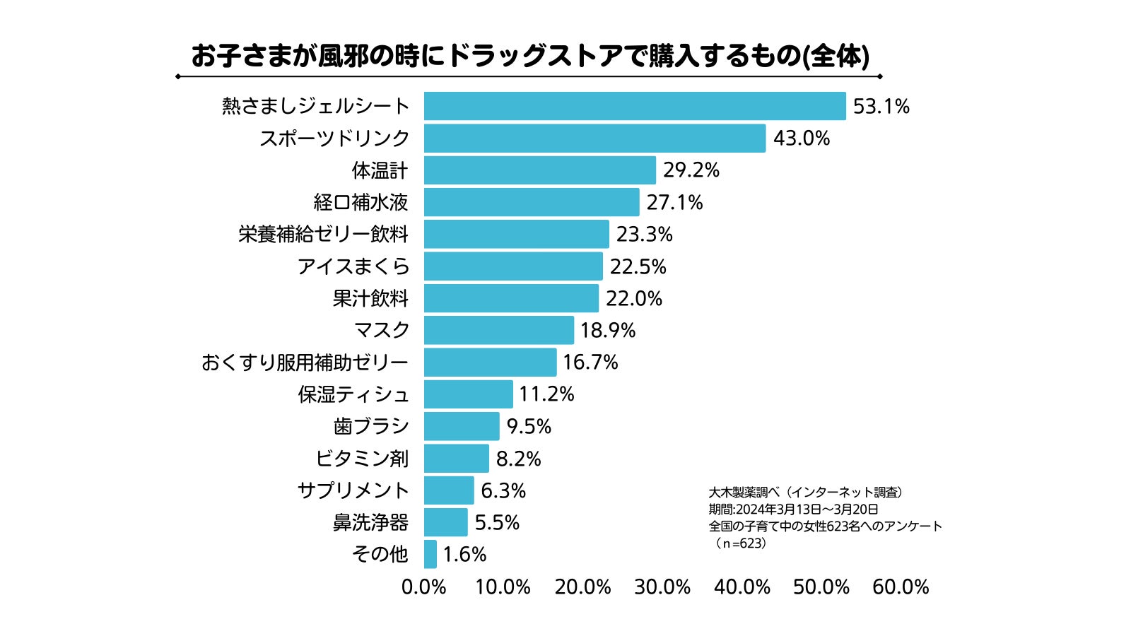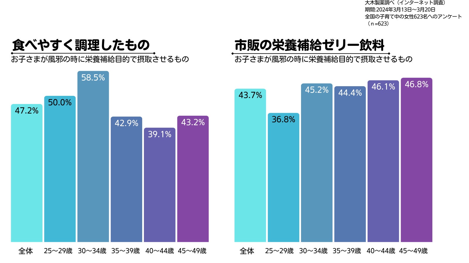 本格的な風邪シーズンが到来いたしました。2024年12月2日に大木製薬株式会社(本社:東京都千代田区、代表取締役社長:松井秀正)がお子様の風邪対策に関するアンケート結果を公表致しました。2024年3月に、全国の子育て中の女性623名(25歳〜49歳)を対象に、お子様が風邪をひいた際の対策や購買行動についてアンケートを実施した調査結果から、家庭で実施されている意外な対策や新たな栄養補給の選択肢が明らかになりましたのでご報告致します。
