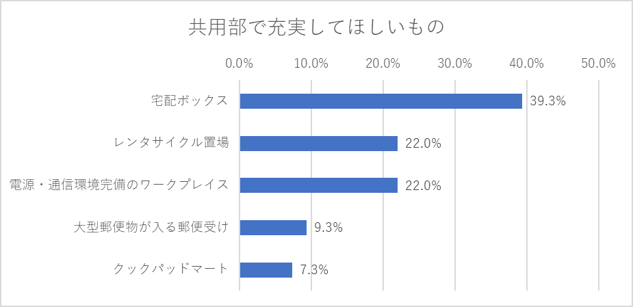 「宅配ボックス」が圧倒的に多く39.3%、次いで「レンタサイクル置場」「電源・通信環境完備のワークプレイス」が22.0%という結果になりました。