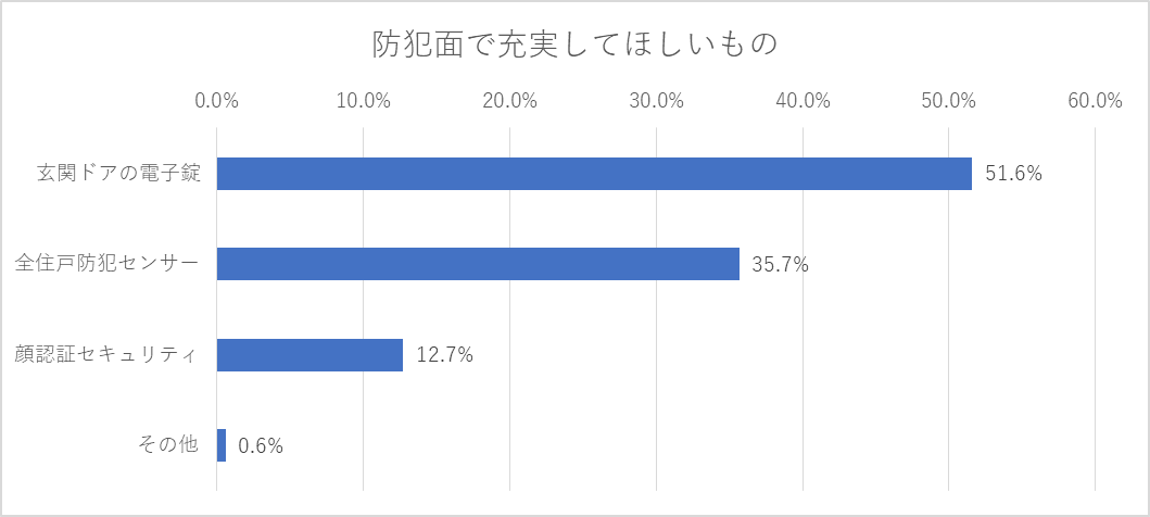 「玄関ドアの電子錠」が51.3%と一番多く、次いで「全住戸防犯センサー」が35.4%、「顔認証セキュリティ」が12.7%という結果になりました。