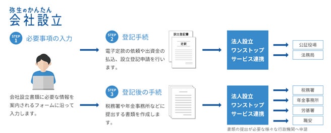 当社では、これまでもWEB上のフォームに沿って必要事項を入力することで、会社の設立登記手続に必要な書類及びその他の行政機関への提出書類を自動で作成するサービス「弥生のかんたん会社設立」を弥生株式会社と共同で開発・運用を行っておりました。