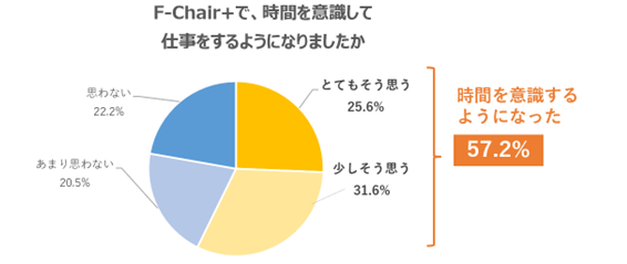 『F-Chair+で時間を意識して仕事をするようになましたか』という問いに対し、6割近くの57.2%が「とてもそう思う」「少しそう思う」と回答しました。