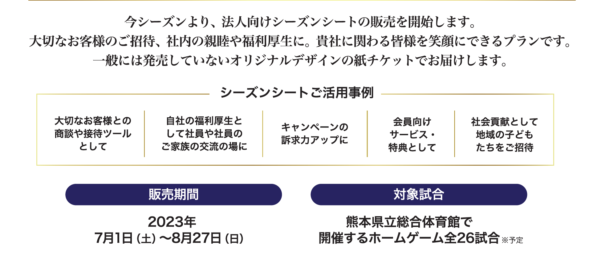 シーズンシートの対象は熊本県立総合体育館で開催予定の全26試合を予定しています。日程や試合時間・対戦相手は、7月28日(金)にBリーグより正式に発表予定です。