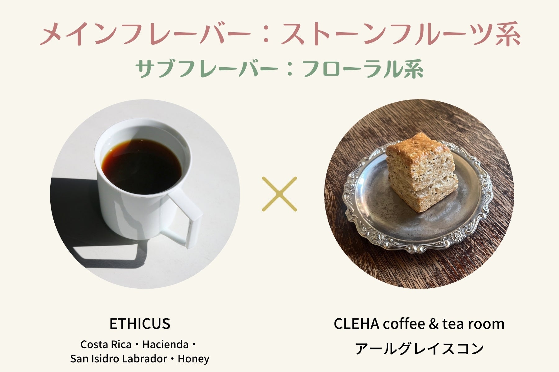 マレーシア諸島原産のフルーツ、ランブータンを口に含んだような芳醇な果実感に加え、りんごやハーブティーの要素を持つコーヒー『Costa Rica・Hacienda San Isidro Labrador・Honey』。ベルガモット香る上質な茶葉を使った『アールグレイスコン』と合わせると、アールグレイの華やかさとバターのやさしい甘みとの相乗効果で、驚くほど華やかな香りが口いっぱいに広がります。