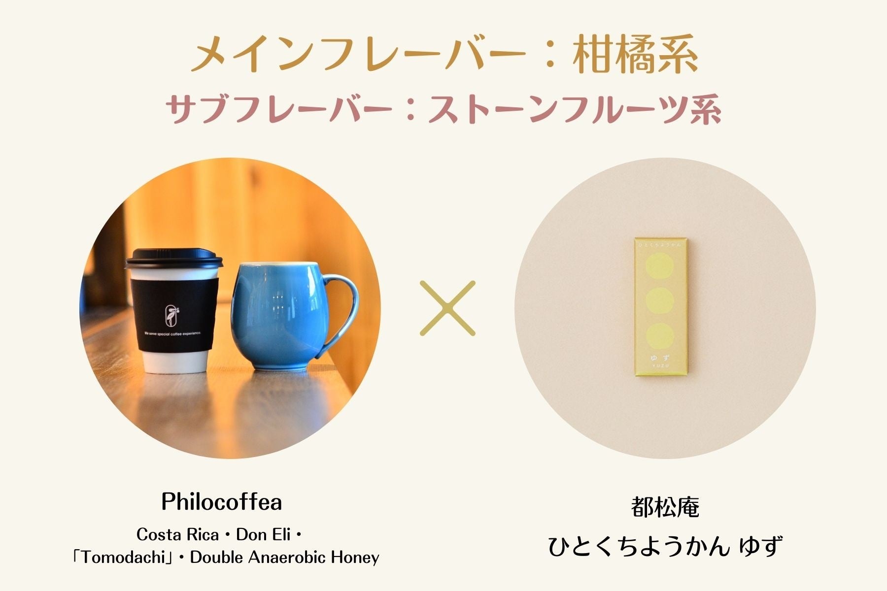 柚子の爽やかで心地よい香りと余韻がやさしく続く『ひとくちようかん ゆず』と、りんごの蜜のようなすっきりとした甘みが引き立つ『Costa Rica・Don Eli・「Tomodachi」・Double Anaerobic Honey』の浅煎りとのペアリング。さっぱりとした柚子にコーヒーの軽やかな後味が重なり、長く続く余韻まで上品でおいしい組み合わせです。