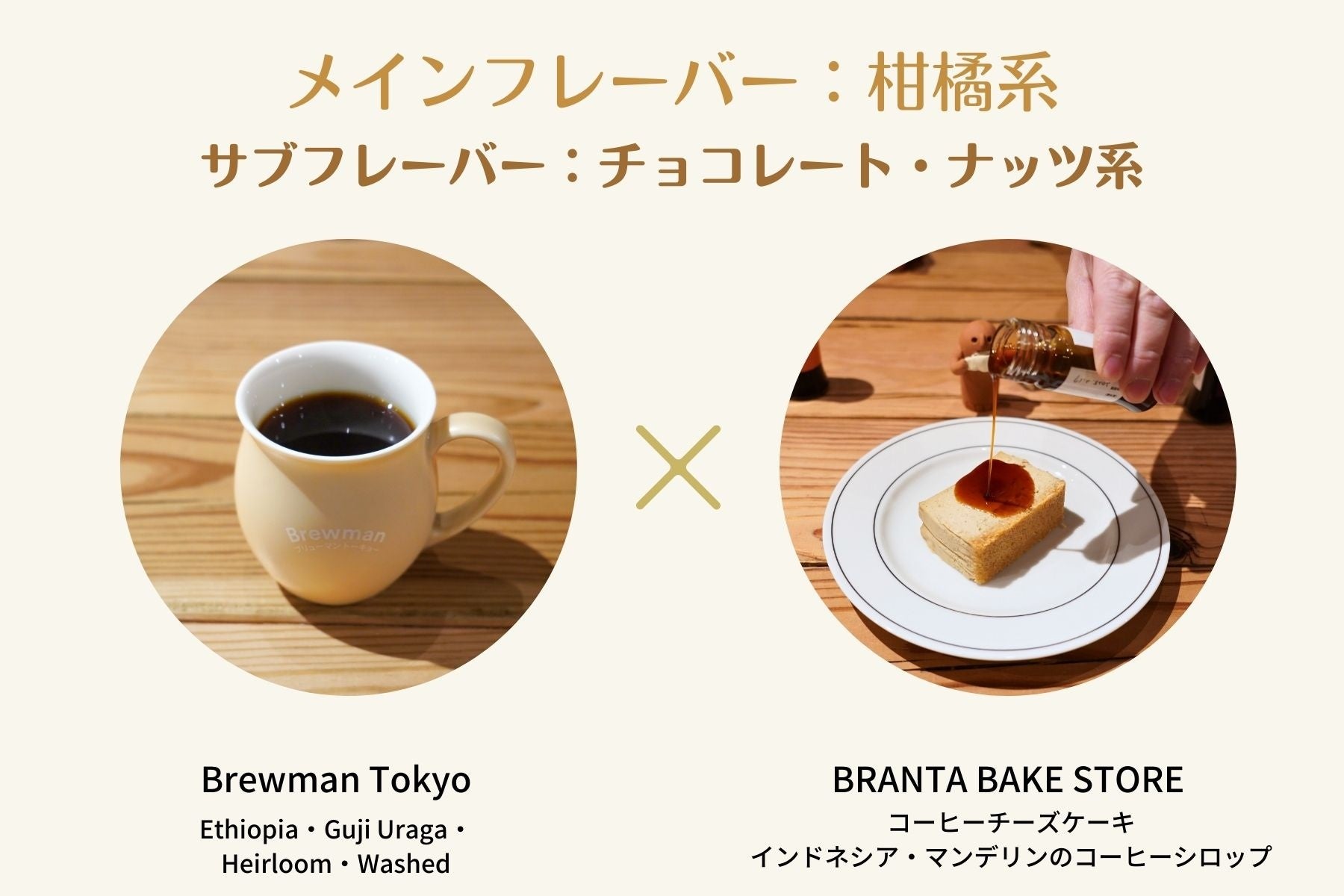 エチオピアの原生種であるHeirloom種でつくられた、柑橘やフローラルな香りとボディ感を持つ『Ethiopia・Guji Uraga・Heirloom・Washed』には、同じくエチオピア産のコーヒーを使い柑橘のアクセントを効かせた『コーヒーチーズケーキ』がおすすめ。すっきりとした酸同士の相性がよく長い余韻が楽しめます。なめらかでクリーミーなチーズケーキは付属のインドネシアのコーヒーシロップをかけることで自分好みのバランスにアレンジも可能です。