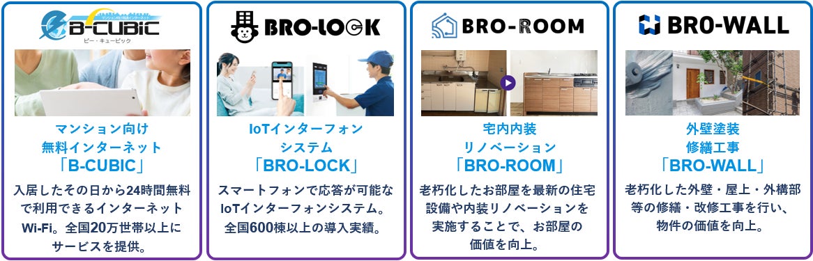 株式会社ブロードエンタープライズは、2000年12月の創業以来、全国の空室問題を解決すべく、マンション向け高速インターネット「B-CUBIC」、IoTインターフォンシステム「BRO-LOCK」、宅内IoTリノベーション「BRO-ROOM」、外壁塗装・大規模修繕工事「BRO-WALL」など、住宅のバリューアップに資するサービスを全国で展開しています。
