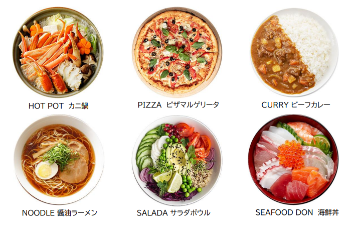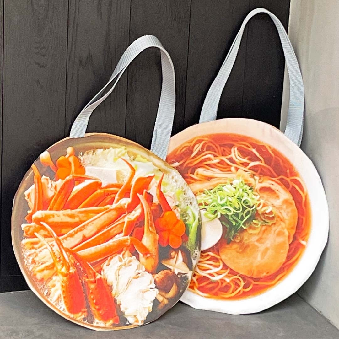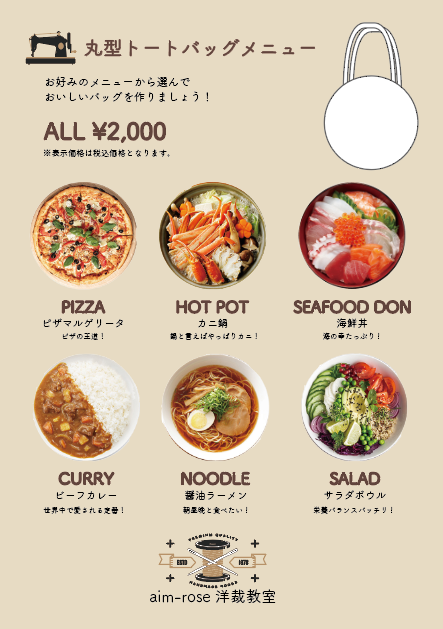 本体験会で作成するのは、デザインがかわいいい丸型トートバッグです。表生地は、ピザ、カニ鍋、海鮮丼、ビーフカレー、醤油ラーメン、サラダボウルの6種類から選べるエイムローズオリジナルデザイン。