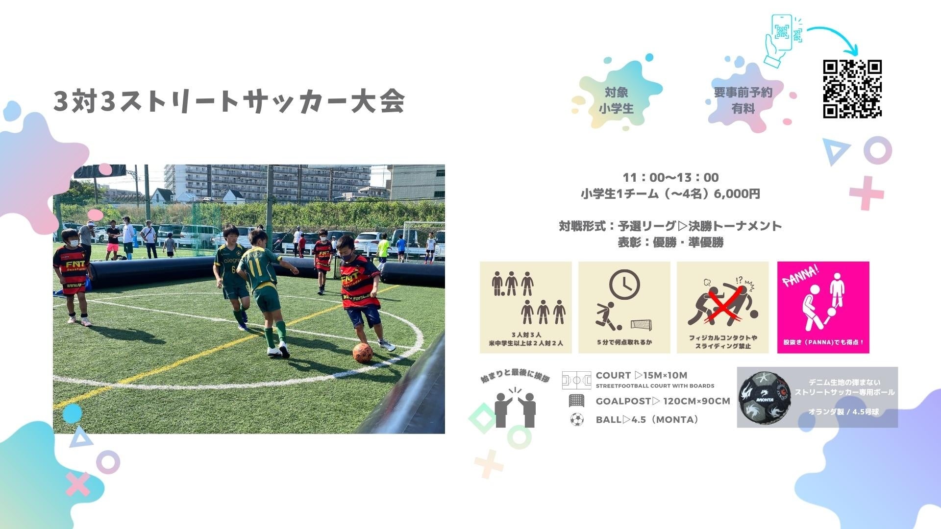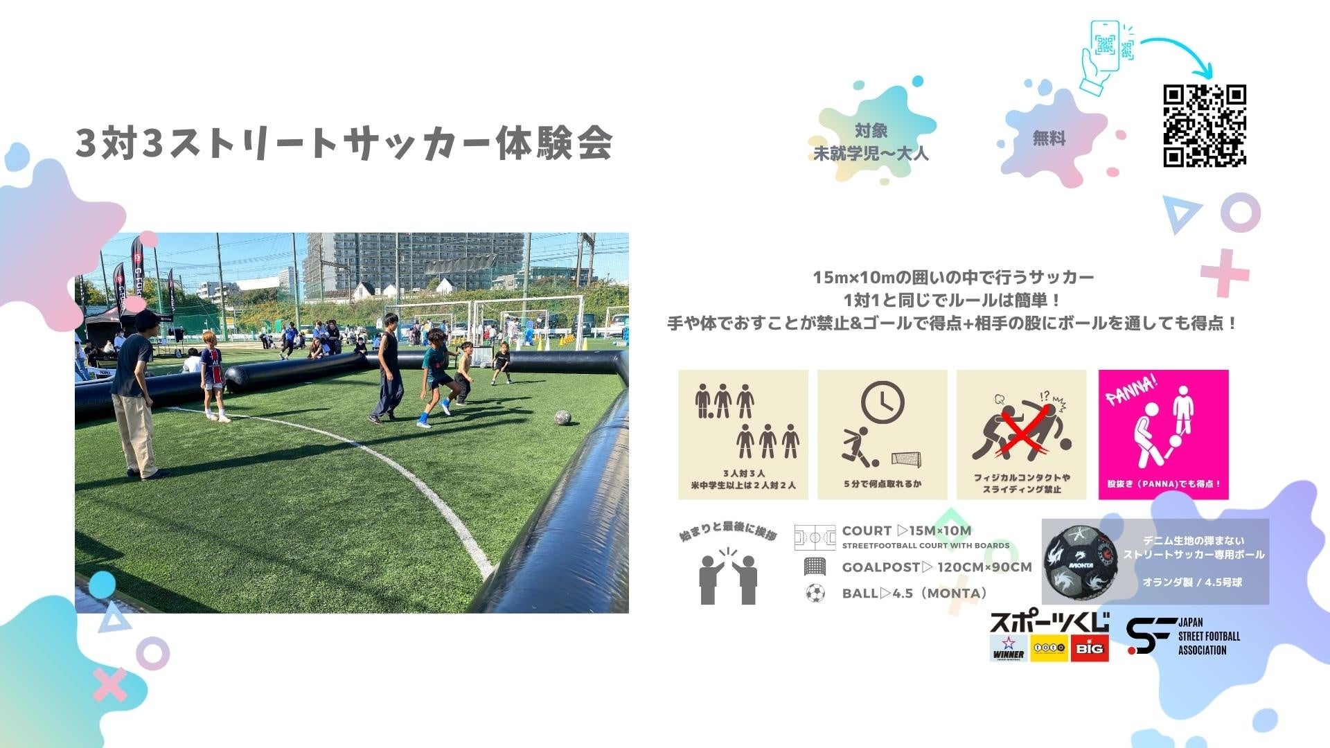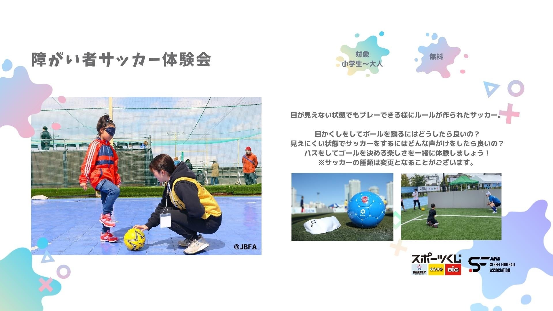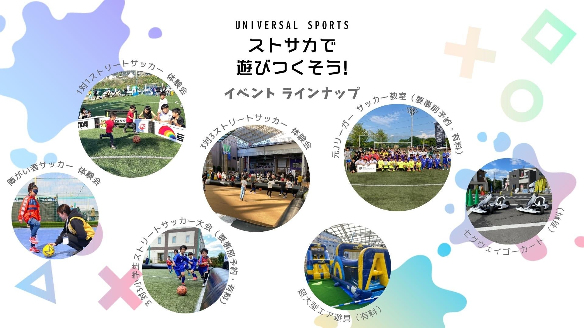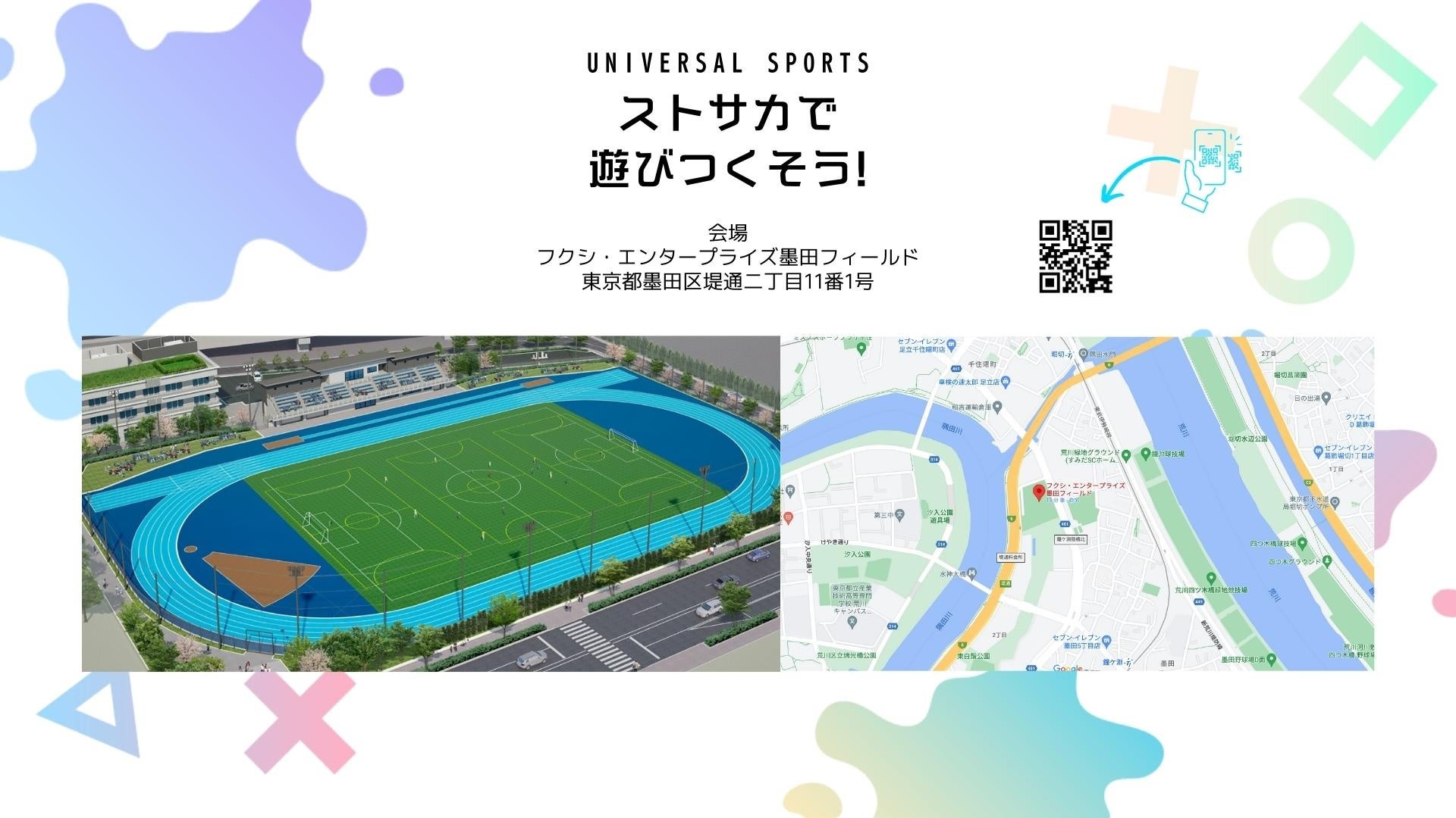 年齢や性別に関係なく一緒に楽しめる「ストリートサッカー」を多くの方に知って頂く為に、この度、ユニバーサルスポーツ「ストサカで遊びつくそう」を開催します。無料で楽しめるストリートサッカーや障がい者サッカー体験会のほか、元Jリーガーによるサッカー教室や3対3のストリートサッカー大会、子供版サスケのようなエア遊具なども用意。墨田区に後援を頂き、フクシ・エンタープライズ墨田フィールドで1日楽しめる遊び場を提供します。