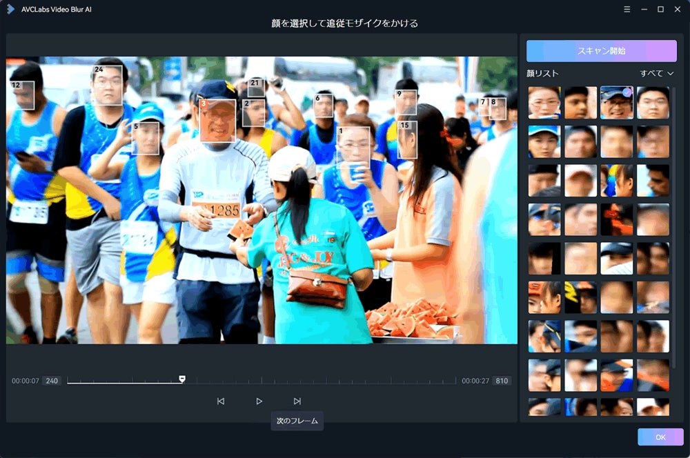 プレビュー画面や顔の一覧からモザイク処理をすべき人物を人間の目で判断し、選択することができます。