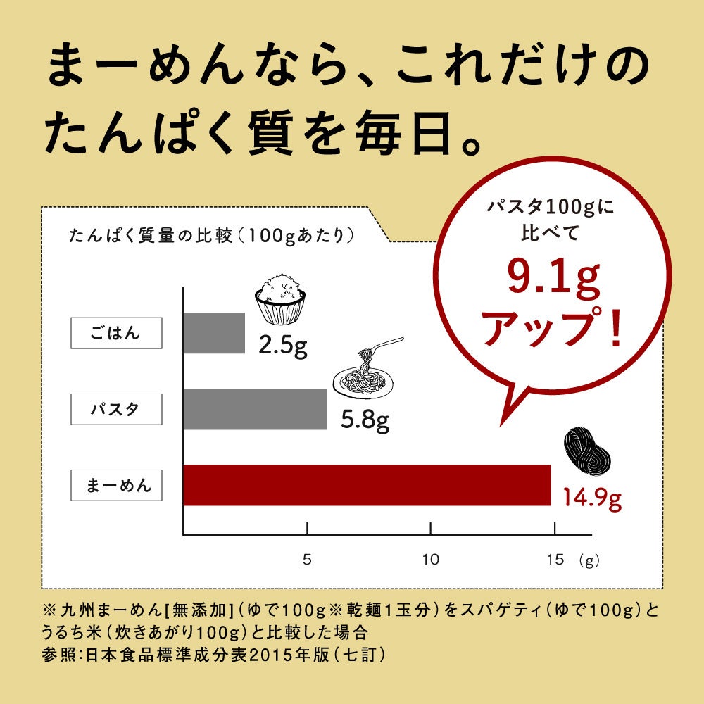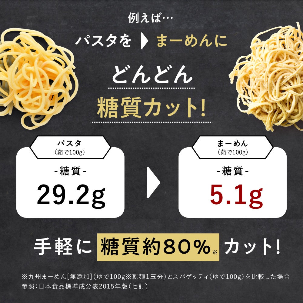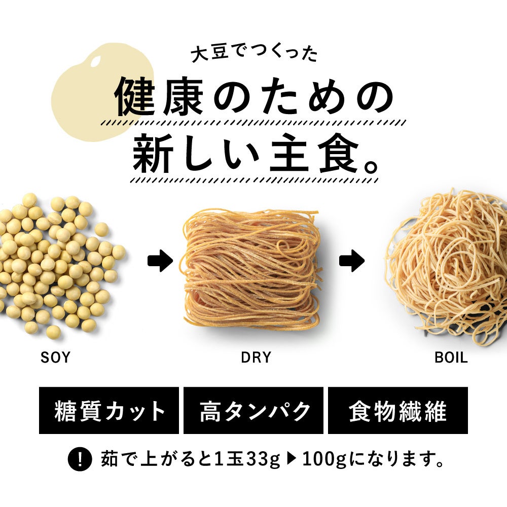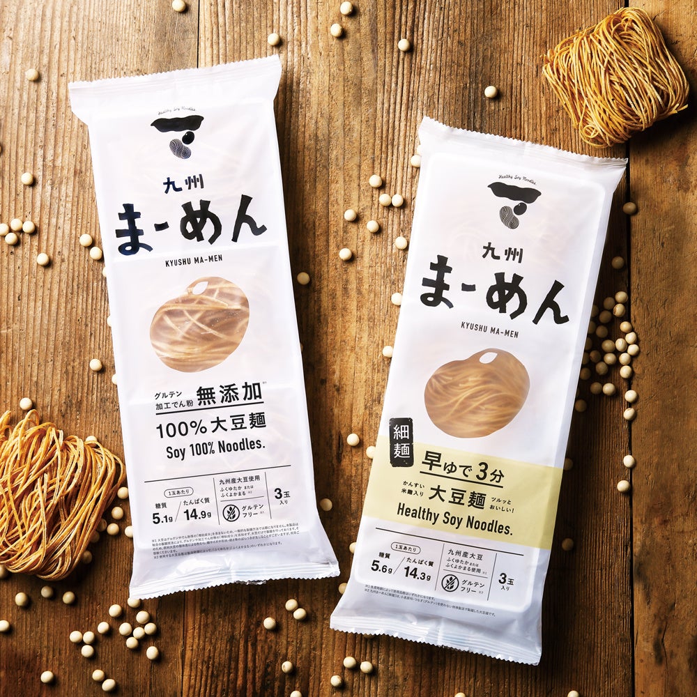「九州まーめん」は、九州産大豆でつくった乾麺です。原料大豆は九州産「ふくゆたか」「ふくよかまる」だけを使用。麺自体が「低糖質」「高たんぱく質」で、1玉に大豆(約50g分)の栄養がギュッと詰まっています。