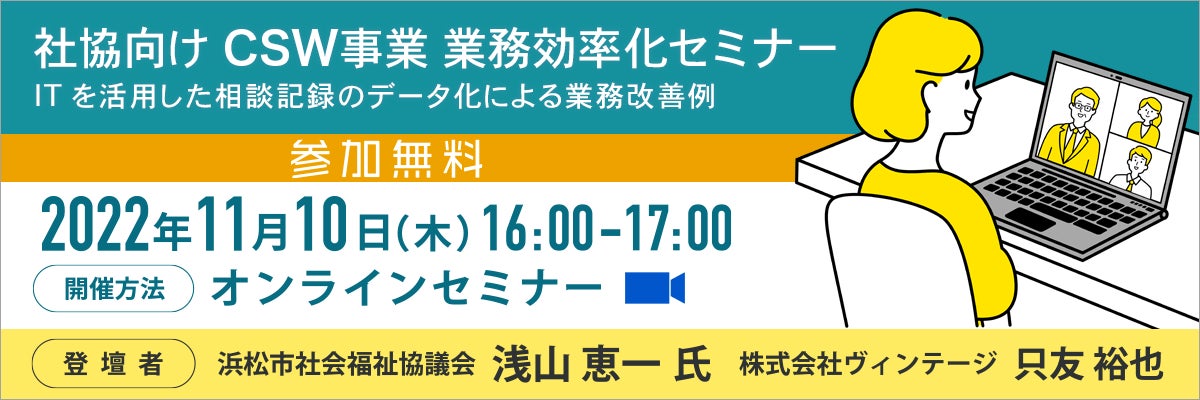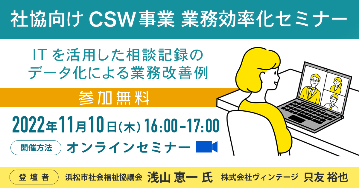株式会社ヴィンテージ(本社:福岡県北九州市、代表:郷田 和正、以下 ヴィンテージ)は、2022年11月10日(木)にオンラインにて社協向け CSW事業 業務効率化セミナーを開催いたします。ゲストに浜松市社会福祉協議会地域支援課 浅山氏を迎え、ITサービスを活用した業務効率化について事例紹介を交えながら、日々の効率的な事業運営についてトークセッションを行います。オンライン開催で参加費無料です。
