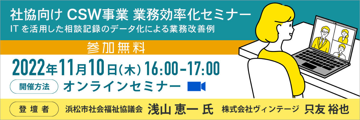 「社会福祉協議会向け CSW事業 業務効率化セミナー」開催/2022年11月10日(木)16時~ オンラインで参加無料