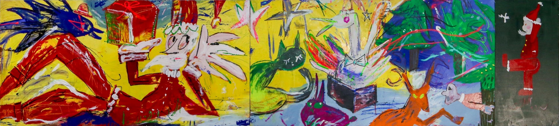 「みんなのクリスマス、12月25日はみんなにやってくる――遠い海の向こう、深海のクジラや魚たち、森の動物たち(ネコも!)、南極のペンギンにシロクマ、太古昔の恐竜たちにも、童話の世界にも、プレゼントを配達だ!トナカイたちもがんばるぜ!雪だるまさん溶けないで!寝坊助サンタも許してあげて、キミのもとへも届けるよ。野原で少し休憩しても優しい雪が降って起こしてくれる。寒いけどへっちゃら!星降る夜空に、上野へサンタとみんなで集合だ!!送りものが遅れて渡しても、サンタは優しく見守ってくれる。今回の作品を通じて、みんなで心を温めよう」