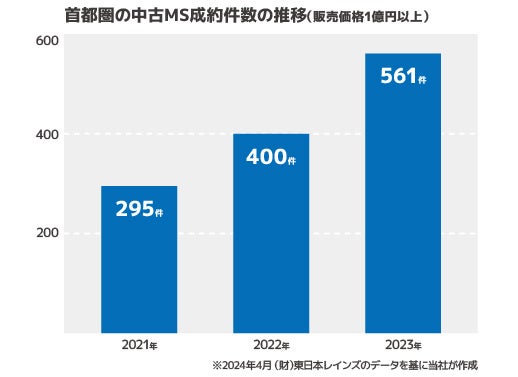 2023年に東京23区内で販売された新築マンションの平均価格が1億円を超えたことが大きな話題となりましたが、不動産価格の高騰は住宅市場全体にも広がり、首都圏の中古マンションも高額帯(販売価格1億円以上)の成約件数が年々増加しています。