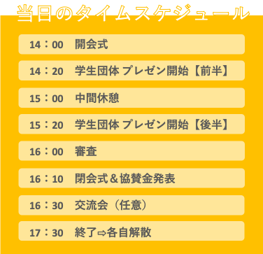 学生サミットとは、地域貢献や社会問題解決などに取り組む学生団体が、地元企業からの協賛金獲得を目指して熱いピッチを披露するコンテストです。