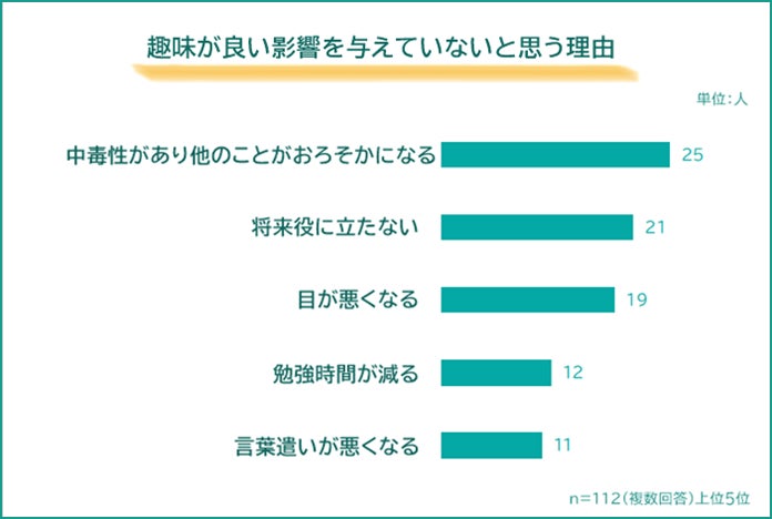 ただ「子どもの趣味に理解がある」と答えた人よりは割合が低くなっているのは気になるところ。「理解しているつもりだけど、正直なところ今の趣味が子どもにとって良いと思えない」と感じている人もいるとわかります。
