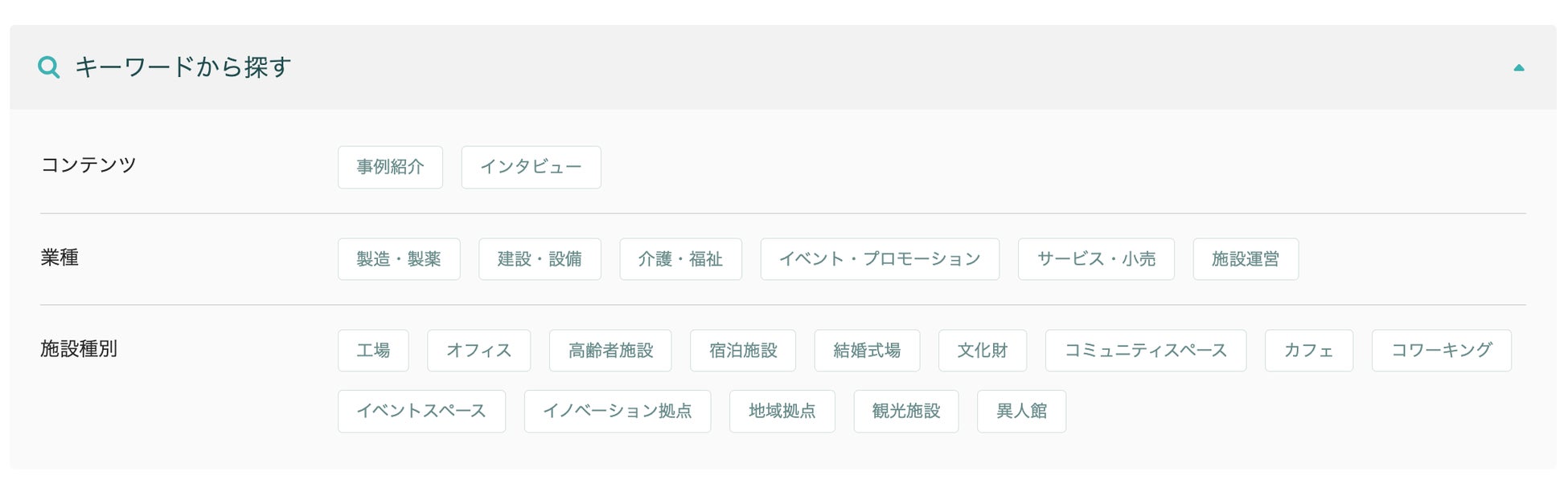 業界や施設の種類で事例を絞り込める検索機能を実装しました。今後、掲載事例が増えても、自社の状況や課題に近い事例をスムーズに見つけ出すことができます。